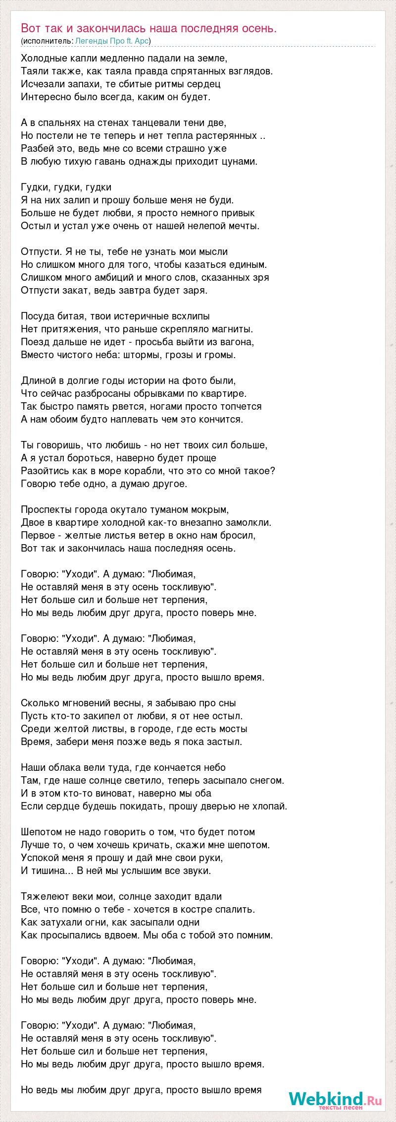 Холодные капли медленно падали на земле, Таяли также, как таяла правда спрятанных взглядов. Исчезали запахи, те сбитые ритмы сердец Интересно было всегда, каким он будет. А в спальнях на стенах танцевали тени две, Но постели не те теперь и нет тепла растерянных .. Разбей это, ведь мне со всеми страшно уже В любую тихую гавань однажды приходит цунами. Гудки, гудки, гудки Я на них залип и прошу больше меня не буди. Больше не будет любви, я просто немного привык Остыл и устал уже очень от нашей нелепой мечты. Отпусти. Я не ты, тебе не узнать мои мысли Но слишком много для того, чтобы казаться единым. Слишком много амбиций и много слов, сказанных зря Отпусти закат, ведь завтра будет заря. Посуда битая, твои истеричные всхлипы Нет притяжения, что раньше скрепляло магниты. Поезд дальше не идет - просьба выйти из вагона, Вместо чистого неба: штормы, грозы и громы. Длиной в долгие годы истории на фото были, Что сейчас разбросаны обрывками по квартире. Так быстро память рвется, ногами просто топчется А нам обоим будто наплевать чем это кончится. Ты говоришь, что любишь - но нет твоих сил больше, А я устал бороться, наверно будет проще Разойтись как в море корабли, что это со мной такое? Говорю тебе одно, а думаю другое. Проспекты города окутало туманом мокрым, Двое в квартире холодной как-то внезапно замолкли. Первое - желтые листья ветер в окно нам бросил, Вот так и закончилась наша последняя осень. Говорю: "Уходи". А думаю: "Любимая, Не оставляй меня в эту осень тоскливую". Нет больше сил и больше нет терпения, Но мы ведь любим друг друга, просто поверь мне. Говорю: "Уходи". А думаю: "Любимая, Не оставляй меня в эту осень тоскливую". Нет больше сил и больше нет терпения, Но мы ведь любим друг друга, просто вышло время. Сколько мгновений весны, я забываю про сны Пусть кто-то закипел от любви, я от нее остыл. Среди желтой листвы, в городе, где есть мосты Время, забери меня позже ведь я пока застыл. Наши облака вели туда, где кончается небо Там, где наше солнце светило, теперь засыпало снегом. И в этом кто-то виноват, наверно мы оба Если сердце будешь покидать, прошу дверью не хлопай. Шепотом не надо говорить о том, что будет потом Лучше то, о чем хочешь кричать, скажи мне шепотом. Успокой меня я прошу и дай мне свои руки, И тишина... В ней мы услышим все звуки. Тяжелеют веки мои, солнце заходит вдали Все, что помню о тебе - хочется в костре спалить. Как затухали огни, как засыпали одни Как просыпались вдвоем. Мы оба с тобой это помним. Говорю: "Уходи". А думаю: "Любимая, Не оставляй меня в эту осень тоскливую". Нет больше сил и больше нет терпения, Но мы ведь любим друг друга, просто поверь мне. Говорю: "Уходи". А думаю: "Любимая, Не оставляй меня в эту осень тоскливую". Нет больше сил и больше нет терпения, Но мы ведь любим друг друга, просто вышло время. Но ведь мы любим друг друга, просто вышло время