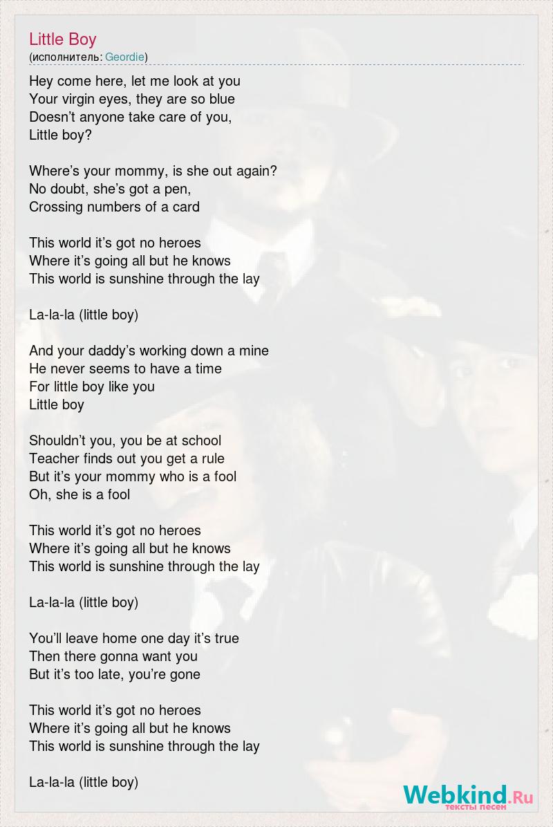 Hey come here, let me look at you Your virgin eyes, they are so blue Doesn’t anyone take care of you, Little boy? Where’s your mommy, is she out again? No doubt, she’s got a pen, Crossing numbers of a card This world it’s got no heroes Where it’s going all but he knows This world is sunshine through the lay La-la-la (little boy) And your daddy’s working down a mine He never seems to have a time For little boy like you Little boy Shouldn’t you, you be at school Teacher finds out you get a rule But it’s your mommy who is a fool Oh, she is a fool This world it’s got no heroes Where it’s going all but he knows This world is sunshine through the lay La-la-la (little boy) You’ll leave home one day it’s true Then there gonna want you But it’s too late, you’re gone This world it’s got no heroes Where it’s going all but he knows This world is sunshine through the lay La-la-la (little boy)
