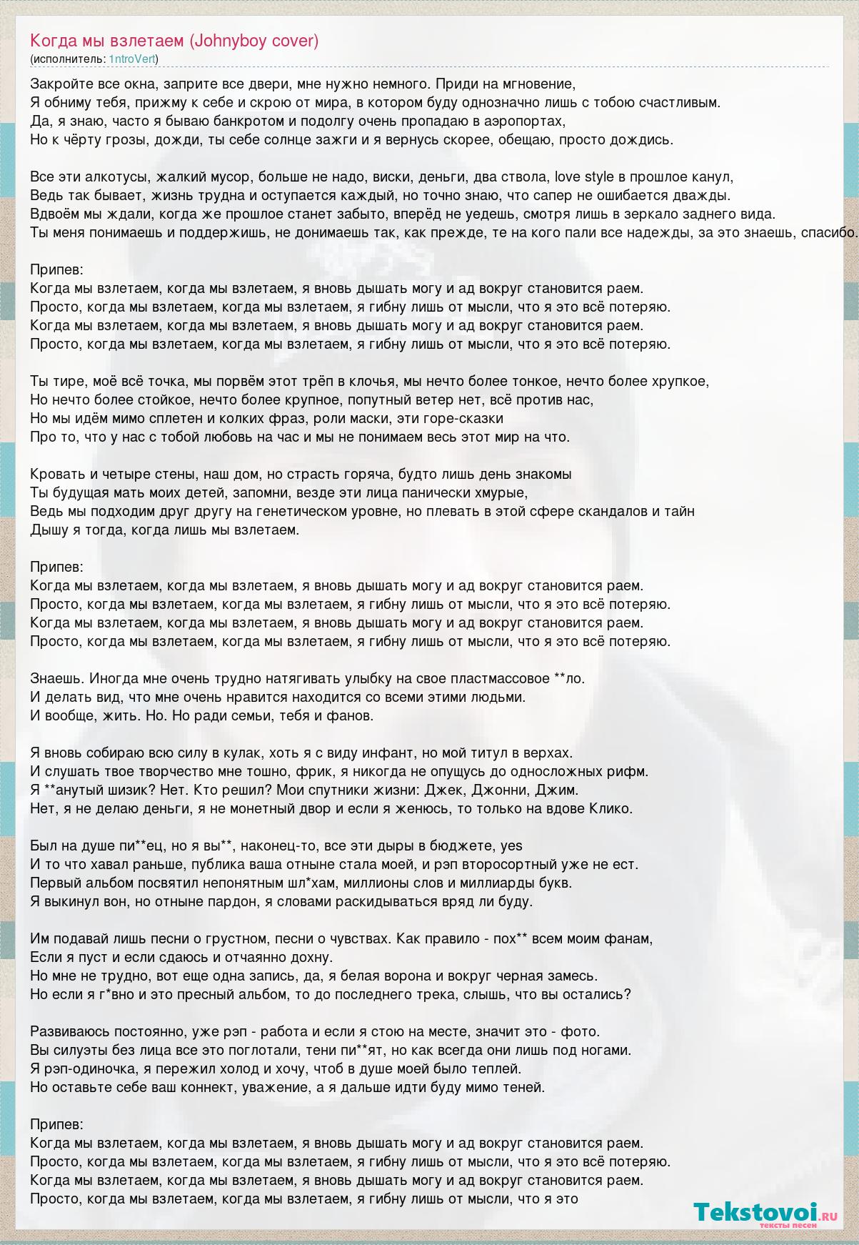 Закройте все окна, заприте все двери, мне нужно немного. Приди на мгновение, Я обниму тебя, прижму к себе и скрою от мира, в котором буду однозначно лишь с тобою счастливым. Да, я знаю, часто я бываю банкротом и подолгу очень пропадаю в аэропортах, Но к чёрту грозы, дожди, ты себе солнце зажги и я вернусь скорее, обещаю, просто дождись. Все эти алкотусы, жалкий мусор, больше не надо, виски, деньги, два ствола, love style в прошлое канул, Ведь так бывает, жизнь трудна и оступается каждый, но точно знаю, что сапер не ошибается дважды. Вдвоём мы ждали, когда же прошлое станет забыто, вперёд не уедешь, смотря лишь в зеркало заднего вида. Ты меня понимаешь и поддержишь, не донимаешь так, как прежде, те на кого пали все надежды, за это знаешь, спасибо. Припев: Когда мы взлетаем, когда мы взлетаем, я вновь дышать могу и ад вокруг становится раем. Просто, когда мы взлетаем, когда мы взлетаем, я гибну лишь от мысли, что я это всё потеряю. Когда мы взлетаем, когда мы взлетаем, я вновь дышать могу и ад вокруг становится раем. Просто, когда мы взлетаем, когда мы взлетаем, я гибну лишь от мысли, что я это всё потеряю. Ты тире, моё всё точка, мы порвём этот трёп в клочья, мы нечто более тонкое, нечто более хрупкое, Но нечто более стойкое, нечто более крупное, попутный ветер нет, всё против нас, Но мы идём мимо сплетен и колких фраз, роли маски, эти горе-сказки Про то, что у нас с тобой любовь на час и мы не понимаем весь этот мир на что. Кровать и четыре стены, наш дом, но страсть горяча, будто лишь день знакомы Ты будущая мать моих детей, запомни, везде эти лица панически хмурые, Ведь мы подходим друг другу на генетическом уровне, но плевать в этой сфере скандалов и тайн Дышу я тогда, когда лишь мы взлетаем. Припев: Когда мы взлетаем, когда мы взлетаем, я вновь дышать могу и ад вокруг становится раем. Просто, когда мы взлетаем, когда мы взлетаем, я гибну лишь от мысли, что я это всё потеряю. Когда мы взлетаем, когда мы взлетаем, я вновь дышать могу и ад вокруг становится раем. Просто, когда мы взлетаем, когда мы взлетаем, я гибну лишь от мысли, что я это всё потеряю. Знаешь. Иногда мне очень трудно натягивать улыбку на свое пластмассовое **ло. И делать вид, что мне очень нравится находится со всеми этими людьми. И вообще, жить. Но. Но ради семьи, тебя и фанов. Я вновь собираю всю силу в кулак, хоть я с виду инфант, но мой титул в верхах. И слушать твое творчество мне тошно, фрик, я никогда не опущусь до односложных рифм. Я **анутый шизик? Нет. Кто решил? Мои спутники жизни: Джек, Джонни, Джим. Нет, я не делаю деньги, я не монетный двор и если я женюсь, то только на вдове Клико. Был на душе пи**ец, но я вы**, наконец-то, все эти дыры в бюджете, yes И то что хавал раньше, публика ваша отныне стала моей, и рэп второсортный уже не ест. Первый альбом посвятил непонятным шл*хам, миллионы слов и миллиарды букв. Я выкинул вон, но отныне пардон, я словами раскидываться вряд ли буду. Им подавай лишь песни о грустном, песни о чувствах. Как правило - пох** всем моим фанам, Если я пуст и если сдаюсь и отчаянно дохну. Но мне не трудно, вот еще одна запись, да, я белая ворона и вокруг черная замесь. Но если я г*вно и это пресный альбом, то до последнего трека, слышь, что вы остались? Развиваюсь постоянно, уже рэп - работа и если я стою на месте, значит это - фото. Вы силуэты без лица все это поглотали, тени пи**ят, но как всегда они лишь под ногами. Я рэп-од