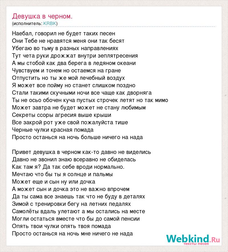 Наебал, говорил не будет таких песен Они Тебе не нравятся меня они так бесят Убегаю во тьму в разных направлениях Тут чета руки дрожжат внутри зеплятресения А мы стобой как два берега в ледяном океани Чувствуем и тонем но остаемся на гране Отпустить но ты же мой лечебный воздух Я может все пойму но станет слишком поздно Стали такими скучными ночи все чаще как дворняга Ты не осьо обочен куча пустых строчек летят но так мимо Может завтра не будет может не стану любимым Секреты ссоры агресия выше крыши Все закрой рот уже свой пожалуйста тише Черные чулки красная помада Просто останься на ночь больше ничего на нада Привет девушка в черном как-то давно не виделись Давно не звонил знаю всеравно не обиделась Как там я? Да так себе вроди нормально. Мечтаю что бы ты я солнце и пальмы Может еще и сын ну или дочка А может сын и дочка это не важно впрочем Да ты сама все знаешь так что не буду в деталях Зимой с тренировки бегу на летних педалях Самолёты вдаль улетают а мы остались на месте Могли остаться вместе что бы до самой пенсии Опять твои чулки опять твоя помада Просто останься на ночь мне ничего не нада