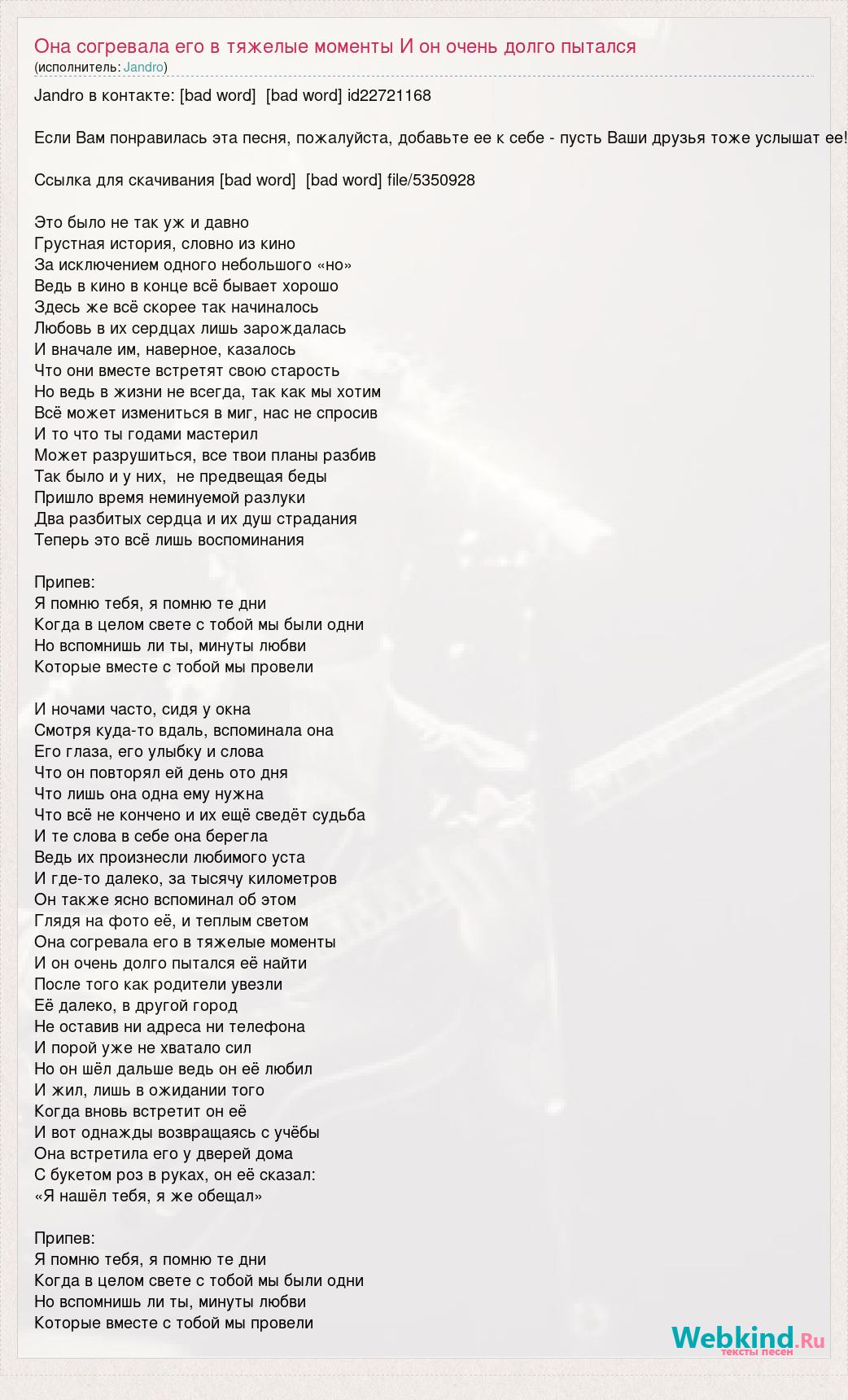 Jandro в контакте: [bad word] [bad word] id22721168 Если Вам понравилась эта песня, пожалуйста, добавьте ее к себе - пусть Ваши друзья тоже услышат ее! Ссылка для скачивания [bad word] [bad word] file/5350928 Это было не так уж и давно Грустная история, словно из кино За исключением одного небольшого «но» Ведь в кино в конце всё бывает хорошо Здесь же всё скорее так начиналось Любовь в их сердцах лишь зарождалась И вначале им, наверное, казалось Что они вместе встретят свою старость Но ведь в жизни не всегда, так как мы хотим Всё может измениться в миг, нас не спросив И то что ты годами мастерил Может разрушиться, все твои планы разбив Так было и у них, не предвещая беды Пришло время неминуемой разлуки Два разбитых сердца и их душ страдания Теперь это всё лишь воспоминания Припев: Я помню тебя, я помню те дни Когда в целом свете с тобой мы были одни Но вспомнишь ли ты, минуты любви Которые вместе с тобой мы провели И ночами часто, сидя у окна Смотря куда-то вдаль, вспоминала она Его глаза, его улыбку и слова Что он повторял ей день ото дня Что лишь она одна ему нужна Что всё не кончено и их ещё сведёт судьба И те слова в себе она берегла Ведь их произнесли любимого уста И где-то далеко, за тысячу километров Он также ясно вспоминал об этом Глядя на фото её, и теплым светом Она согревала его в тяжелые моменты И он очень долго пытался её найти После того как родители увезли Её далеко, в другой город Не оставив ни адреса ни телефона И порой уже не хватало сил Но он шёл дальше ведь он её любил И жил, лишь в ожидании того Когда вновь встретит он её И вот однажды возвращаясь с учёбы Она встретила его у дверей дома С букетом роз в руках, он её сказал: «Я нашёл тебя, я же обещал» Припев: Я помню тебя, я помню те дни Когда в целом свете с тобой мы были одни Но вспомнишь ли ты, минуты любви Которые вместе с тобой мы провели