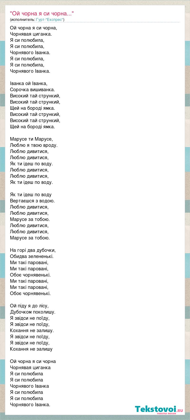 Ой чорна я си чорна, Чорнявая циганка. Я си полюбила, Я си полюбила, Чорнявого Іванка. Я си полюбила, Я си полюбила, Чорнявого Іванка. Іванка ой Іванка, Сорочка вишиванка. Високий тай стрункий, Високий тай стрункий, Щей на бороді ямка. Високий тай стрункий, Високий тай стрункий, Щей на бороді ямка. Марусе ти Марусе, Люблю я твою вроду. Люблю дивитися, Люблю дивитися, Як ти ідеш по воду. Люблю дивитися, Люблю дивитися, Як ти ідеш по воду. Як ти ідеш по воду Вертаєшся з водою. Люблю дивитися, Люблю дивитися, Марусе за тобою. Люблю дивитися, Люблю дивитися, Марусе за тобою. На горі два дубочки, Обидва зелененькі. Ми такі паровані, Ми такі паровані, Обоє чорнявенькі. Ми такі паровані, Ми такі паровані, Обоє чорнявенькі. Ой піду я до лісу, Дубочком поколишу. Я звідси не поїду, Я звідси не поїду, Кохання не залишу. Я звідси не поїду, Я звідси не поїду, Кохання не залишу Ой чорна я си чорна Чорнявая циганка Я си полюбила Я си полюбила Чорнявого Іванка Я си полюбила Я си полюбила Чорнявого Іванка.