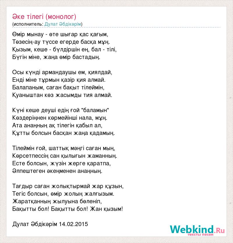 Өмір мынау - өте шығар қас қағым, Төзесің-ау түссе егерде басқа мұң. Қызым, кеше - бүлдіршін ең, бал - тілі, Бүгін міне, жаңа өмір бастадың. Осы күнді армандаушы ем, қиялдай, Енді міне тұрмын қазір қия алмай. Балапаным, саған бақыт тілеймін, Қуаныштан көз жасымды тия алмай. Күні кеше деуші едің ғой "баламын" Көздеріңнен көрмейінші нала, мұң. Ата анаңның ақ тілегін қабыл ал, Құтты болсын басқан жаңа қадамың. Тілеймін ғой, шаттық мәңгі саған мың, Көрсетпессің сан қылығын жаманның. Есте болсын, жүзін жерге қаратпа, Әлпештеген әкеңменен анаңның. Тағдыр саған жолықтырмай жар құзын, Тегіс болсын, өмір жолың жалғызым. Жаратқанның жылуына бөленіп, Бақытты бол! Бақытты бол! Жан қызым! Дулат Әбдікәрім 14.02.2015