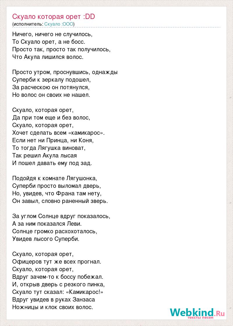 Ничего, ничего не случилось, То Скуало орет, а не босс. Просто так, просто так получилось, Что Акула лишился волос. Просто утром, проснувшись, однажды Суперби к зеркалу подошел, За расческою он потянулся, Но волос он своих не нашел. Скуало, которая орет, Да при том еще и без волос, Скуало, которая орет, Хочет сделать всем «камикарос». Если нет ни Принца, ни Коня, То тогда Лягушка виноват, Так решил Акула лысая И пошел давать ему под зад. Подойдя к комнате Лягушонка, Суперби просто выломал дверь, Но, увидев, что Франа там нету, Он завыл, словно раненный зверь. За углом Солнце вдруг показалось, А за ним показался Леви. Солнце громко расхохоталось, Увидев лысого Суперби. Скуало, которая орет, Офицеров тут же всех прогнал. Скуало, которая орет, Вдруг зачем-то к боссу побежал. И, открыв дверь с резкого пинка, Скуало тут сказал: «Камикарос!» Вдруг увидев в руках Занзаса Ножницы и клок своих волос.