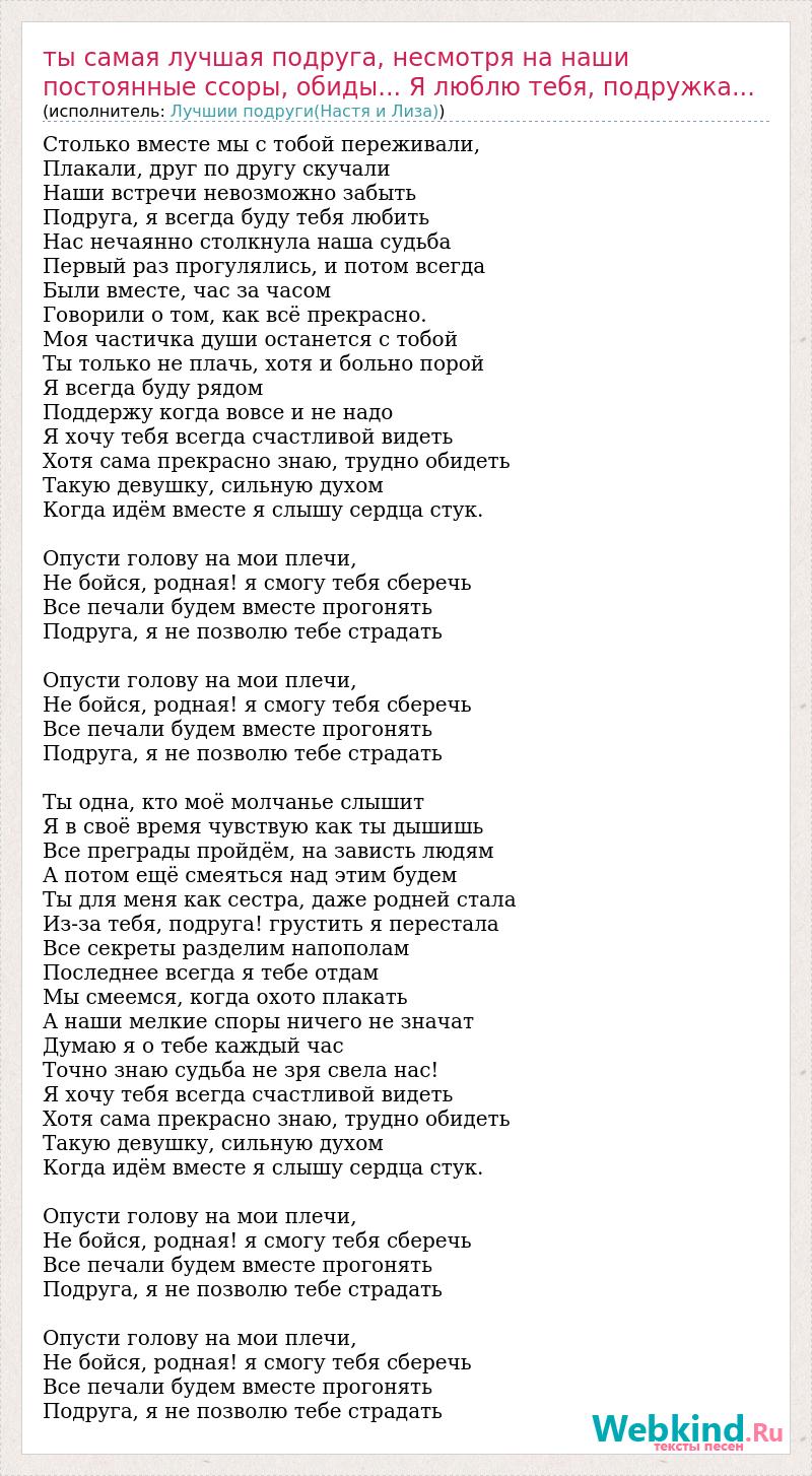 Столько вместе мы с тобой переживали, Плакали, друг по другу скучали Наши встречи невозможно забыть Подруга, я всегда буду тебя любить Нас нечаянно столкнула наша судьба Первый раз прогулялись, и потом всегда Были вместе, час за часом Говорили о том, как всё прекрасно. Моя частичка души останется с тобой Ты только не плачь, хотя и больно порой Я всегда буду рядом Поддержу когда вовсе и не надо Я хочу тебя всегда счастливой видеть Хотя сама прекрасно знаю, трудно обидеть Такую девушку, сильную духом Когда идём вместе я слышу сердца стук. Опусти голову на мои плечи, Не бойся, родная! я смогу тебя сберечь Все печали будем вместе прогонять Подруга, я не позволю тебе страдать Опусти голову на мои плечи, Не бойся, родная! я смогу тебя сберечь Все печали будем вместе прогонять Подруга, я не позволю тебе страдать Ты одна, кто моё молчанье слышит Я в своё время чувствую как ты дышишь Все преграды пройдём, на зависть людям А потом ещё смеяться над этим будем Ты для меня как сестра, даже родней стала Из-за тебя, подруга! грустить я перестала Все секреты разделим напополам Последнее всегда я тебе отдам Мы смеемся, когда охото плакать А наши мелкие споры ничего не значат Думаю я о тебе каждый час Точно знаю судьба не зря свела нас! Я хочу тебя всегда счастливой видеть Хотя сама прекрасно знаю, трудно обидеть Такую девушку, сильную духом Когда идём вместе я слышу сердца стук. Опусти голову на мои плечи, Не бойся, родная! я смогу тебя сберечь Все печали будем вместе прогонять Подруга, я не позволю тебе страдать Опусти голову на мои плечи, Не бойся, родная! я смогу тебя сберечь Все печали будем вместе прогонять Подруга, я не позволю тебе страдать