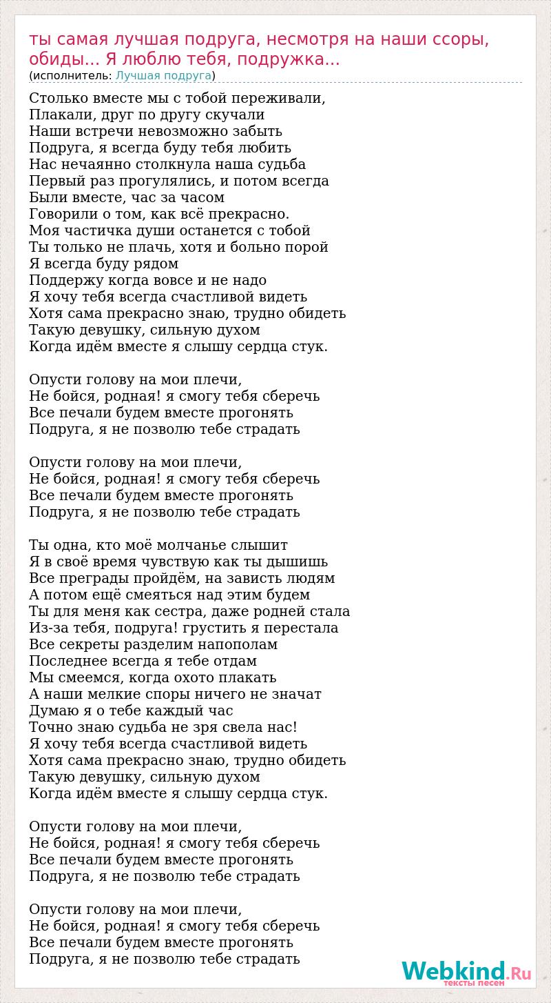 Столько вместе мы с тобой переживали, Плакали, друг по другу скучали Наши встречи невозможно забыть Подруга, я всегда буду тебя любить Нас нечаянно столкнула наша судьба Первый раз прогулялись, и потом всегда Были вместе, час за часом Говорили о том, как всё прекрасно. Моя частичка души останется с тобой Ты только не плачь, хотя и больно порой Я всегда буду рядом Поддержу когда вовсе и не надо Я хочу тебя всегда счастливой видеть Хотя сама прекрасно знаю, трудно обидеть Такую девушку, сильную духом Когда идём вместе я слышу сердца стук. Опусти голову на мои плечи, Не бойся, родная! я смогу тебя сберечь Все печали будем вместе прогонять Подруга, я не позволю тебе страдать Опусти голову на мои плечи, Не бойся, родная! я смогу тебя сберечь Все печали будем вместе прогонять Подруга, я не позволю тебе страдать Ты одна, кто моё молчанье слышит Я в своё время чувствую как ты дышишь Все преграды пройдём, на зависть людям А потом ещё смеяться над этим будем Ты для меня как сестра, даже родней стала Из-за тебя, подруга! грустить я перестала Все секреты разделим напополам Последнее всегда я тебе отдам Мы смеемся, когда охото плакать А наши мелкие споры ничего не значат Думаю я о тебе каждый час Точно знаю судьба не зря свела нас! Я хочу тебя всегда счастливой видеть Хотя сама прекрасно знаю, трудно обидеть Такую девушку, сильную духом Когда идём вместе я слышу сердца стук. Опусти голову на мои плечи, Не бойся, родная! я смогу тебя сберечь Все печали будем вместе прогонять Подруга, я не позволю тебе страдать Опусти голову на мои плечи, Не бойся, родная! я смогу тебя сберечь Все печали будем вместе прогонять Подруга, я не позволю тебе страдать