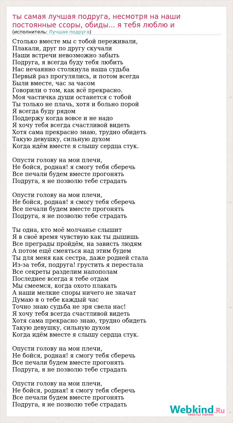 Столько вместе мы с тобой переживали, Плакали, друг по другу скучали Наши встречи невозможно забыть Подруга, я всегда буду тебя любить Нас нечаянно столкнула наша судьба Первый раз прогулялись, и потом всегда Были вместе, час за часом Говорили о том, как всё прекрасно. Моя частичка души останется с тобой Ты только не плачь, хотя и больно порой Я всегда буду рядом Поддержу когда вовсе и не надо Я хочу тебя всегда счастливой видеть Хотя сама прекрасно знаю, трудно обидеть Такую девушку, сильную духом Когда идём вместе я слышу сердца стук. Опусти голову на мои плечи, Не бойся, родная! я смогу тебя сберечь Все печали будем вместе прогонять Подруга, я не позволю тебе страдать Опусти голову на мои плечи, Не бойся, родная! я смогу тебя сберечь Все печали будем вместе прогонять Подруга, я не позволю тебе страдать Ты одна, кто моё молчанье слышит Я в своё время чувствую как ты дышишь Все преграды пройдём, на зависть людям А потом ещё смеяться над этим будем Ты для меня как сестра, даже родней стала Из-за тебя, подруга! грустить я перестала Все секреты разделим напополам Последнее всегда я тебе отдам Мы смеемся, когда охото плакать А наши мелкие споры ничего не значат Думаю я о тебе каждый час Точно знаю судьба не зря свела нас! Я хочу тебя всегда счастливой видеть Хотя сама прекрасно знаю, трудно обидеть Такую девушку, сильную духом Когда идём вместе я слышу сердца стук. Опусти голову на мои плечи, Не бойся, родная! я смогу тебя сберечь Все печали будем вместе прогонять Подруга, я не позволю тебе страдать Опусти голову на мои плечи, Не бойся, родная! я смогу тебя сберечь Все печали будем вместе прогонять Подруга, я не позволю тебе страдать