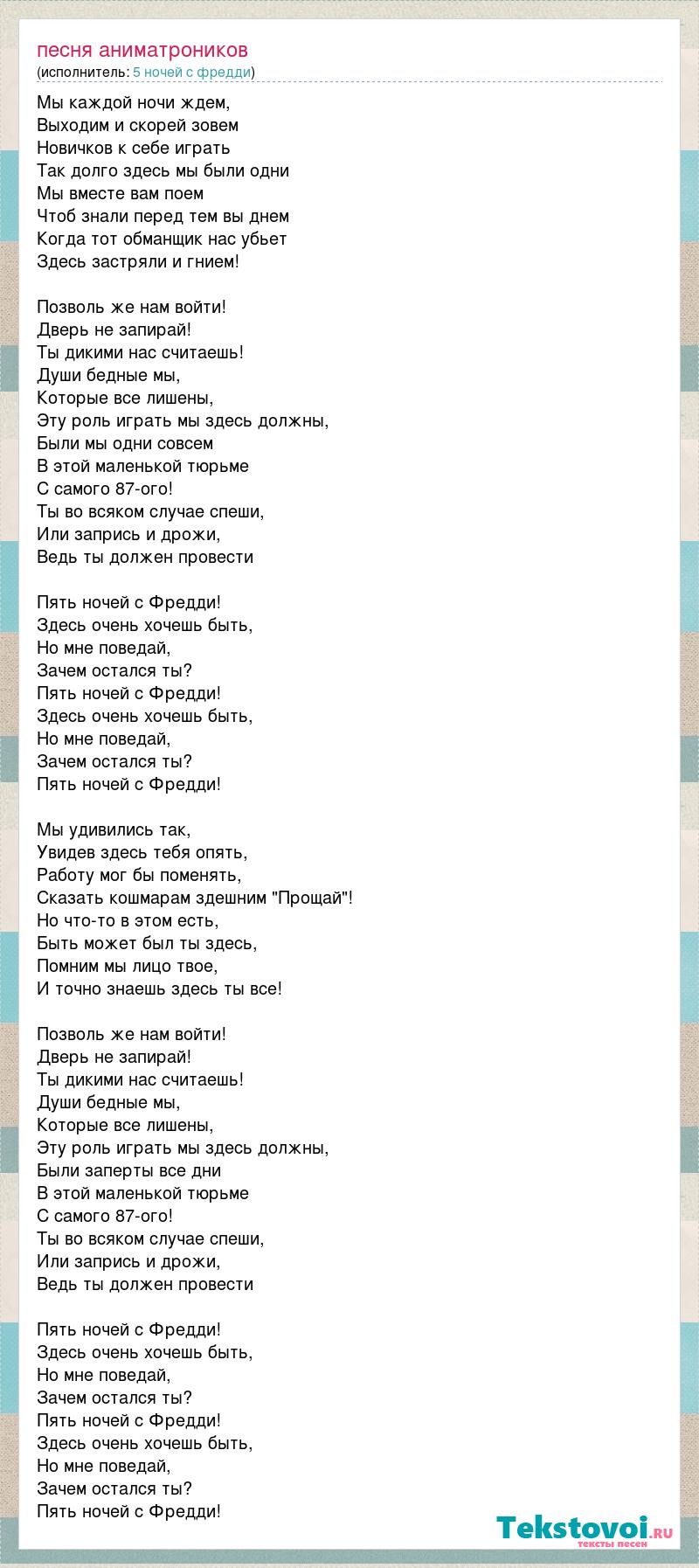 Мы каждой ночи ждем, Выходим и скорей зовем Новичков к себе играть Так долго здесь мы были одни Мы вместе вам поем Чтоб знали перед тем вы днем Когда тот обманщик нас убьет Здесь застряли и гнием! Позволь же нам войти! Дверь не запирай! Ты дикими нас считаешь! Души бедные мы, Которые все лишены, Эту роль играть мы здесь должны, Были мы одни совсем В этой маленькой тюрьме С самого 87-ого! Ты во всяком случае спеши, Или запрись и дрожи, Ведь ты должен провести Пять ночей с Фредди! Здесь очень хочешь быть, Но мне поведай, Зачем остался ты? Пять ночей с Фредди! Здесь очень хочешь быть, Но мне поведай, Зачем остался ты? Пять ночей с Фредди! Мы удивились так, Увидев здесь тебя опять, Работу мог бы поменять, Сказать кошмарам здешним "Прощай"! Но что-то в этом есть, Быть может был ты здесь, Помним мы лицо твое, И точно знаешь здесь ты все! Позволь же нам войти! Дверь не запирай! Ты дикими нас считаешь! Души бедные мы, Которые все лишены, Эту роль играть мы здесь должны, Были заперты все дни В этой маленькой тюрьме С самого 87-ого! Ты во всяком случае спеши, Или запрись и дрожи, Ведь ты должен провести Пять ночей с Фредди! Здесь очень хочешь быть, Но мне поведай, Зачем остался ты? Пять ночей с Фредди! Здесь очень хочешь быть, Но мне поведай, Зачем остался ты? Пять ночей с Фредди!