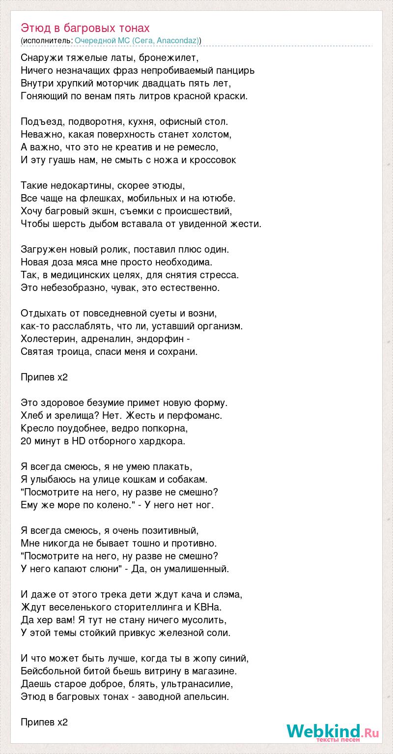 Снаружи тяжелые латы, бронежилет, Ничего незначащих фраз непробиваемый панцирь Внутри хрупкий моторчик двадцать пять лет, Гоняющий по венам пять литров красной краски. Подъезд, подворотня, кухня, офисный стол. Неважно, какая поверхность станет холстом, А важно, что это не креатив и не ремесло, И эту гуашь нам, не смыть с ножа и кроссовок Такие недокартины, скорее этюды, Все чаще на флешках, мобильных и на ютюбе. Хочу багровый экшн, съемки с происшествий, Чтобы шерсть дыбом вставала от увиденной жести. Загружен новый ролик, поставил плюс один. Новая доза мяса мне просто необходима. Так, в медицинских целях, для снятия стресса. Это небезобразно, чувак, это естественно. Отдыхать от повседневной суеты и возни, как-то расслаблять, что ли, уставший организм. Холестерин, адреналин, эндорфин - Святая троица, спаси меня и сохрани. Припев x2 Это здоровое безумие примет новую форму. Хлеб и зрелища? Нет. Жесть и перфоманс. Кресло поудобнее, ведро попкорна, 20 минут в HD отборного хардкора. Я всегда смеюсь, я не умею плакать, Я улыбаюсь на улице кошкам и собакам. "Посмотрите на него, ну разве не смешно? Ему же море по колено." - У него нет ног. Я всегда смеюсь, я очень позитивный, Мне никогда не бывает тошно и противно. "Посмотрите на него, ну разве не смешно? У него капают слюни" - Да, он умалишенный. И даже от этого трека дети ждут кача и слэма, Ждут веселенького сторителлинга и КВНа. Да хер вам! Я тут не стану ничего мусолить, У этой темы стойкий привкус железной соли. И что может быть лучше, когда ты в жопу синий, Бейсбольной битой бьешь витрину в магазине. Даешь старое доброе, блять, ультранасилие, Этюд в багровых тонах - заводной апельсин. Припев x2