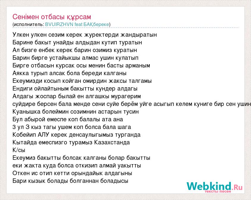 Улкен улкен сезим керек журектерди жандыратын Барине бакыт унайды алдыдан кутип туратын Ал бизге енбек керек барин озимиз куратын Барин бирге устайыкшы алмас ушин кулатып Бирге отбасын курсак осы менин басты арманым Аякка турып алсак бола береди калганы Екеумизди косып койган омирдин жаксы талгамы Ендиги ойлайтыным бакытты кундер алдагы Алдагы жоспар былай ен алгашкы мурагерим суйдире берсен бала менде сени суйе берём уйге асыгып келем куниге бир сен ушин Куанышка болеймин созимнин астарын тусин Бул абырой емеспе коп балалы ата ана 3 ул З кыз тагы ушем коп болса бала шага Кобейип АЛУ керек денсаулыгымыз турганда Кытайда емеспизго турамыз Казахстанда К/сы Екеумиз бакытты болсак калганы болар бакытты еки жакта куда болса откизип алмай уакытты Откен ис отип кетти орындайык алдагыны Бари кызык болады болганнан боладысы