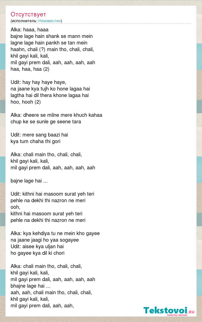 Alka: haaa, haaa bajne lage hain shank se mann mein lagne lage hain pankh se tan mein haahn, chali (?) main tho, chali, chali, khil gayi kali, kali, mil gayi prem dali, aah, aah, aah, aah haa, haa, haa (2) Udit: hay hay haye haye, na jaane kya tujh ko hone lagaa hai lagtha hai dil thera khone lagaa hai hoo, hooh (2) Alka: dheere se milne mere khuch kahaa chup ke se sunle ge seene tara Udit: mere sang baazi hai kya tum chaha thi gori Alka: chali main tho, chali, chali, khil gayi kali, kali, mil gayi prem dali, aah, aah, aah, aah bajne lage hai ... Udit: kithni hai masoom surat yeh teri pehle na dekhi thi nazron ne meri ooh, kithni hai masoom surat yeh teri pehle na dekhi thi nazron ne meri Alka: kya kehdiya tu ne mein kho gayee na jaane jaagi ho yaa sogayee Udit: aisee kya uljan hai ho gayee kya dil ki chori Alka: chali main tho, chali, chali, khil gayi kali, kali, mil gayi prem dali, aah, aah, aah, aah bhajne lage hai ... aah, aah, chali main tho, chali, chali, khil gayi kali, kali, mil gayi prem dali, aah, aah,
