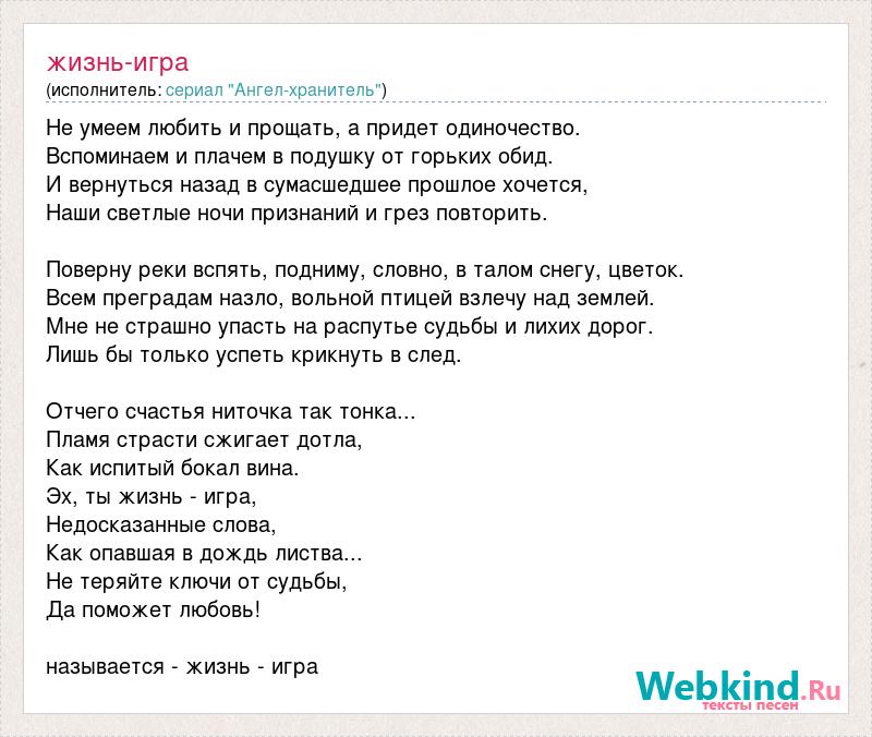 Не умеем любить и прощать, а придет одиночество. Вспоминаем и плачем в подушку от горьких обид. И вернуться назад в сумасшедшее прошлое хочется, Наши светлые ночи признаний и грез повторить. Поверну реки вспять, подниму, словно, в талом снегу, цветок. Всем преградам назло, вольной птицей взлечу над землей. Мне не страшно упасть на распутье судьбы и лихих дорог. Лишь бы только успеть крикнуть в след. Отчего счастья ниточка так тонка... Пламя страсти сжигает дотла, Как испитый бокал вина. Эх, ты жизнь - игра, Недосказанные слова, Как опавшая в дождь листва... Не теряйте ключи от судьбы, Да поможет любовь! называется - жизнь - игра