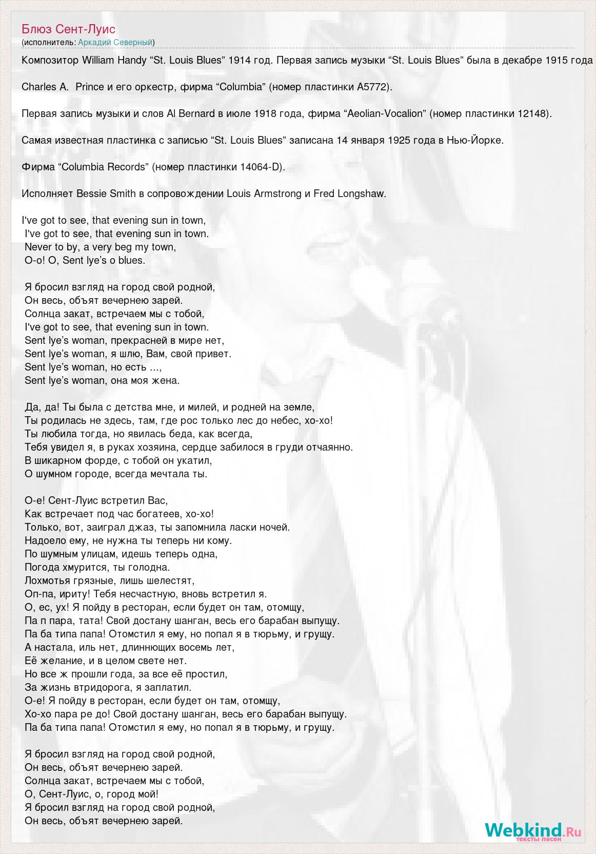 Композитор William Handy “St. Louis Blues” 1914 год. Первая запись музыки “St. Louis Blues” была в декабре 1915 года Charles A. Prince и его оркестр, фирма “Columbia” (номер пластинки А5772). Первая запись музыки и слов Al Bernard в июле 1918 года, фирма “Aeolian-Vocalion” (номер пластинки 12148). Самая известная пластинка с записью “St. Louis Blues” записана 14 января 1925 года в Нью-Йорке. Фирма “Columbia Records” (номер пластинки 14064-D). Исполняет Bessie Smith в сопровождении Louis Armstrong и Fred Longshaw. I've got to see, that evening sun in town, I've got to see, that evening sun in town. Never to by, a very beg my town, O-o! O, Sent lye’s o blues. Я бросил взгляд на город свой родной, Он весь, объят вечернею зарей. Солнца закат, встречаем мы с тобой, I've got to see, that evening sun in town. Sent lye’s woman, прекрасней в мире нет, Sent lye’s woman, я шлю, Вам, свой привет. Sent lye’s woman, но есть ..., Sent lye’s woman, она моя жена. Да, да! Ты была с детства мне, и милей, и родней на земле, Ты родилась не здесь, там, где рос только лес до небес, хо-хо! Ты любила тогда, но явилась беда, как всегда, Тебя увидел я, в руках хозяина, сердце забилося в груди отчаянно. В шикарном форде, с тобой он укатил, О шумном городе, всегда мечтала ты. О-е! Сент-Луис встретил Вас, Как встречает под час богатеев, хо-хо! Только, вот, заиграл джаз, ты запомнила ласки ночей. Надоело ему, не нужна ты теперь ни кому. По шумным улицам, идешь теперь одна, Погода хмурится, ты голодна. Лохмотья грязные, лишь шелестят, Оп-па, ириту! Тебя несчастную, вновь встретил я. О, ес, ух! Я пойду в ресторан, если будет он там, отомщу, Па п пара, тата! Свой достану шанган, весь его барабан выпущу. Па ба типа папа! Отомстил я ему, но попал я в тюрьму, и грущу. А настала, иль нет, длиннющих восемь лет, Её желание, и в целом свете нет. Но все ж прошли года, за все её простил, За жизнь втридорога, я заплатил. О-е! Я пойду в ресторан, если будет он там, отомщу, Хо-хо пара ре до! Свой достану шанган, весь его барабан выпущу. Па ба типа папа! Отомстил я ему, но попал я в тюрьму, и грущу. Я бросил взгляд на город свой родной, Он весь, объят вечернею зарей. Солнца закат, встречаем мы с тобой, О, Сент-Луис, о, город мой! Я бросил взгляд на город свой родной, Он весь, объят вечернею зарей.