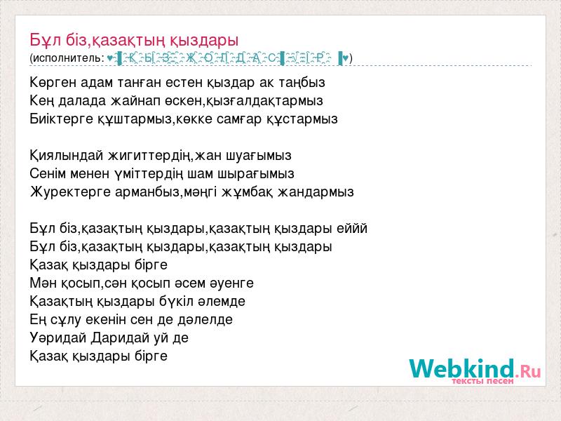Көрген адам танған естен қыздар ак таңбыз Кең далада жайнап өскен,қызғалдақтармыз Биіктерге құштармыз,көкке самғар құстармыз Қиялындай жигиттердің,жан шуағымыз Сенім менен үміттердің шам шырағымыз Журектерге арманбыз,мәңгі жұмбақ жандармыз Бұл біз,қазақтың қыздары,қазақтың қыздары еййй Бұл біз,қазақтың қыздары,қазақтың қыздары Қазақ қыздары бірге Мән қосып,сән қосып әсем әуенге Қазақтың қыздары бүкіл әлемде Ең сұлу екенін сен де дәлелде Уәридай Даридай уй де Қазақ қыздары бірге