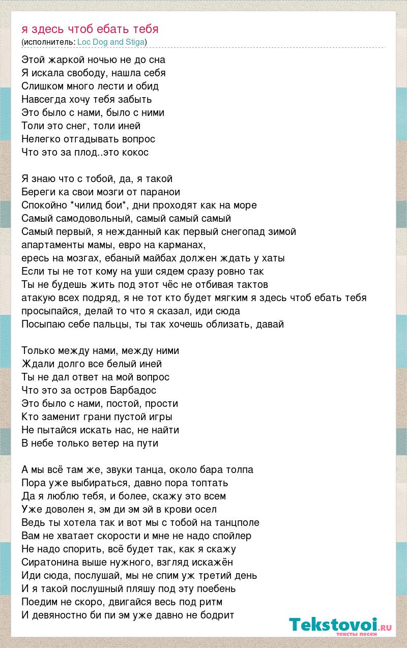 Этой жаркой ночью не до сна Я искала свободу, нашла себя Слишком много лести и обид Навсегда хочу тебя забыть Это было с нами, было с ними Толи это снег, толи иней Нелегко отгадывать вопрос Что это за плод..это кокос Я знаю что с тобой, да, я такой Береги ка свои мозги от паранои Спокойно *чилид бои*, дни проходят как на море Самый самодовольный, самый самый самый Самый первый, я нежданный как первый снегопад зимой апартаменты мамы, евро на карманах, ересь на мозгах, ебаный майбах должен ждать у хаты Если ты не тот кому на уши сядем сразу ровно так Ты не будешь жить под этот чёс не отбивая тактов атакую всех подряд, я не тот кто будет мягким я здесь чтоб ебать тебя просыпайся, делай то что я сказал, иди сюда Посыпаю себе пальцы, ты так хочешь облизать, давай Только между нами, между ними Ждали долго все белый иней Ты не дал ответ на мой вопрос Что это за остров Барбадос Это было с нами, постой, прости Кто заменит грани пустой игры Не пытайся искать нас, не найти В небе только ветер на пути А мы всё там же, звуки танца, около бара толпа Пора уже выбираться, давно пора топтать Да я люблю тебя, и более, скажу это всем Уже доволен я, эм ди эм эй в крови осел Ведь ты хотела так и вот мы с тобой на танцполе Вам не хватает скорости и мне не надо спойлер Не надо спорить, всё будет так, как я скажу Сиратонина выше нужного, взгляд искажён Иди сюда, послушай, мы не спим уж третий день И я такой послушный пляшу под эту поебень Поедим не скоро, двигайся весь под ритм И девяностно би пи эм уже давно не бодрит
