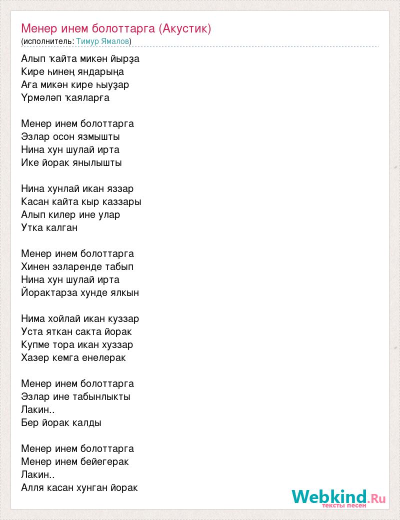 Алып ҡайта микән йырҙа Кире һинең яндарыңа Аға микән кире һыуҙар Үрмәләп ҡаяларға Менер инем болоттарга Эзлар осон язмышты Нина хун шулай ирта Ике йорак янылышты Нина хунлай икан яззар Касан кайта кыр каззары Алып килер ине улар Утка калган Менер инем болоттарга Хинен эзларенде табып Нина хун шулай ирта Йорактарза хунде ялкын Нима хойлай икан куззар Уста яткан сакта йорак Купме тора икан хуззар Хазер кемга енелерак Менер инем болоттарга Эзлар ине табынлыкты Лакин.. Бер йорак калды Менер инем болоттарга Менер инем бейегерак Лакин.. Алля касан хунган йорак