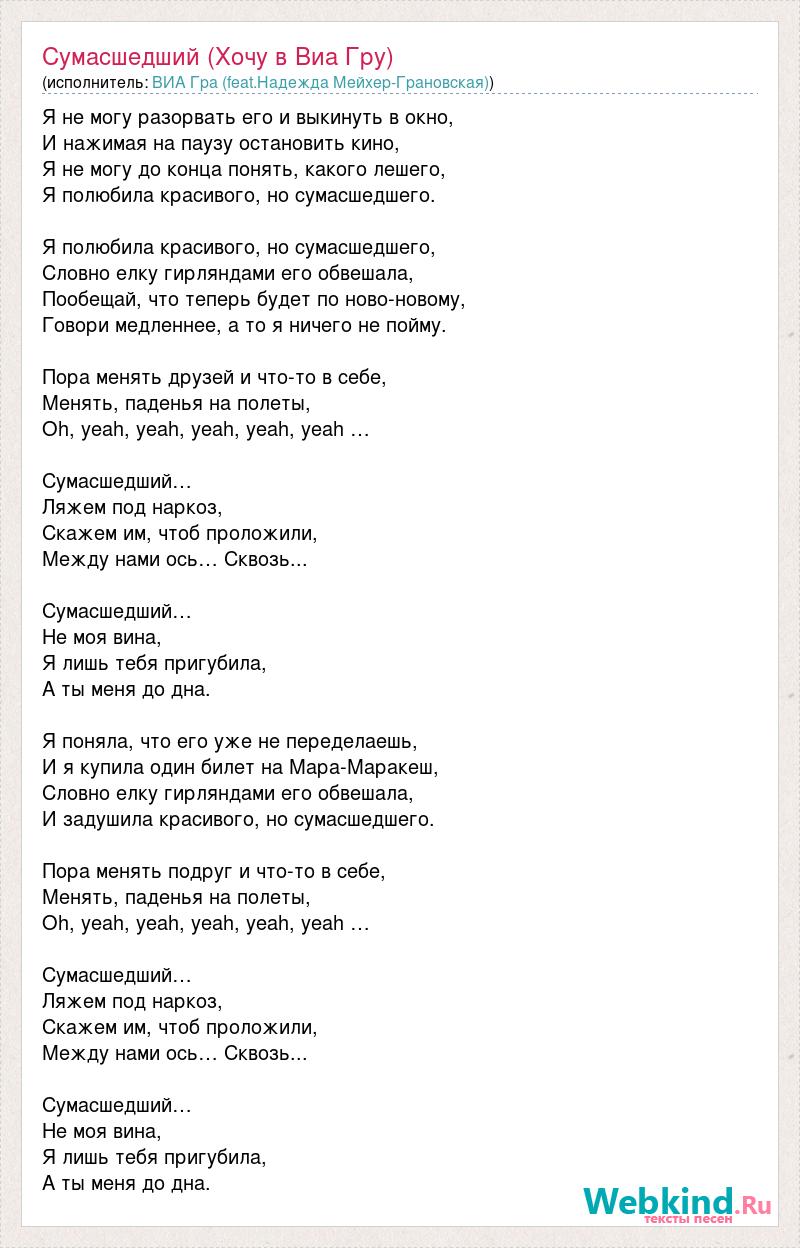 Я не могу разорвать его и выкинуть в окно, И нажимая на паузу остановить кино, Я не могу до конца понять, какого лешего, Я полюбила красивого, но сумасшедшего. Я полюбила красивого, но сумасшедшего, Словно елку гирляндами его обвешала, Пообещай, что теперь будет по ново-новому, Говори медленнее, а то я ничего не пойму. Пора менять друзей и что-то в себе, Менять, паденья на полеты, Oh, yeah, yeah, yeah, yeah, yeah … Сумасшедший… Ляжем под наркоз, Скажем им, чтоб проложили, Между нами ось… Сквозь... Сумасшедший… Не моя вина, Я лишь тебя пригубила, А ты меня до дна. Я поняла, что его уже не переделаешь, И я купила один билет на Мара-Маракеш, Словно елку гирляндами его обвешала, И задушила красивого, но сумасшедшего. Пора менять подруг и что-то в себе, Менять, паденья на полеты, Oh, yeah, yeah, yeah, yeah, yeah … Сумасшедший… Ляжем под наркоз, Скажем им, чтоб проложили, Между нами ось… Сквозь... Сумасшедший… Не моя вина, Я лишь тебя пригубила, А ты меня до дна.