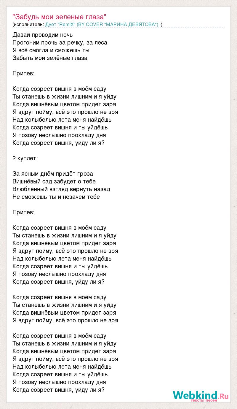 Давай проводим ночь Прогоним прочь за речку, за леса Я всё смогла и сможешь ты Забыть мои зелёные глаза Припев: Когда созреет вишня в моём саду Ты станешь в жизни лишним и я уйду Когда вишнёвым цветом придет заря Я вдруг пойму, всё это прошло не зря Над колыбелью лета меня найдёшь Когда созреет вишня и ты уйдёшь Я позову неслышно прохладу дня Когда созреет вишня, уйду ли я? 2 куплет: За ясным днём придёт гроза Вишнёвый сад забудет о тебе Влюблённый взгляд вернуть назад Не сможешь ты и незачем тебе Припев: Когда созреет вишня в моём саду Ты станешь в жизни лишним и я уйду Когда вишнёвым цветом придет заря Я вдруг пойму, всё это прошло не зря Над колыбелью лета меня найдёшь Когда созреет вишня и ты уйдёшь Я позову неслышно прохладу дня Когда созреет вишня, уйду ли я? Когда созреет вишня в моём саду Ты станешь в жизни лишним и я уйду Когда вишнёвым цветом придет заря Я вдруг пойму, всё это прошло не зря Когда созреет вишня в моём саду Ты станешь в жизни лишним и я уйду Когда вишнёвым цветом придет заря Я вдруг пойму, всё это прошло не зря Над колыбелью лета меня найдёшь Когда созреет вишня и ты уйдёшь Я позову неслышно прохладу дня Когда созреет вишня, уйду ли я?