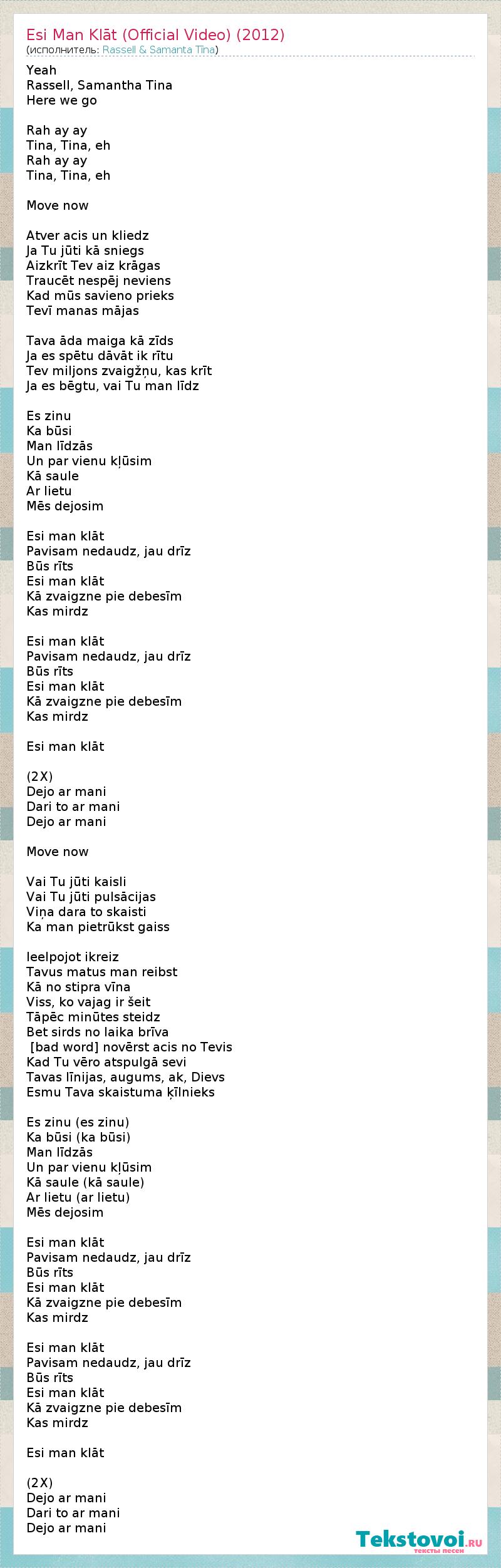 Yeah Rassell, Samantha Tina Here we go Rah ay ay Tina, Tina, eh Rah ay ay Tina, Tina, eh Move now Atver acis un kliedz Ja Tu jūti kā sniegs Aizkrīt Tev aiz krāgas Traucēt nespēj neviens Kad mūs savieno prieks Tevī manas mājas Tava āda maiga kā zīds Ja es spētu dāvāt ik rītu Tev miljons zvaigžņu, kas krīt Ja es bēgtu, vai Tu man līdz Es zinu Ka būsi Man līdzās Un par vienu kļūsim Kā saule Ar lietu Mēs dejosim Esi man klāt Pavisam nedaudz, jau drīz Būs rīts Esi man klāt Kā zvaigzne pie debesīm Kas mirdz Esi man klāt Pavisam nedaudz, jau drīz Būs rīts Esi man klāt Kā zvaigzne pie debesīm Kas mirdz Esi man klāt (2X) Dejo ar mani Dari to ar mani Dejo ar mani Move now Vai Tu jūti kaisli Vai Tu jūti pulsācijas Viņa dara to skaisti Ka man pietrūkst gaiss Ieelpojot ikreiz Tavus matus man reibst Kā no stipra vīna Viss, ko vajag ir šeit Tāpēc minūtes steidz Bet sirds no laika brīva Nevaru novērst acis no Tevis Kad Tu vēro atspulgā sevi Tavas līnijas, augums, ak, Dievs Esmu Tava skaistuma ķīlnieks Es zinu (es zinu) Ka būsi (ka būsi) Man līdzās Un par vienu kļūsim Kā saule (kā saule) Ar lietu (ar lietu) Mēs dejosim Esi man klāt Pavisam nedaudz, jau drīz Būs rīts Esi man klāt Kā zvaigzne pie debesīm Kas mirdz Esi man klāt Pavisam nedaudz, jau drīz Būs rīts Esi man klāt Kā zvaigzne pie debesīm Kas mirdz Esi man klāt (2X) Dejo ar mani Dari to ar mani Dejo ar mani