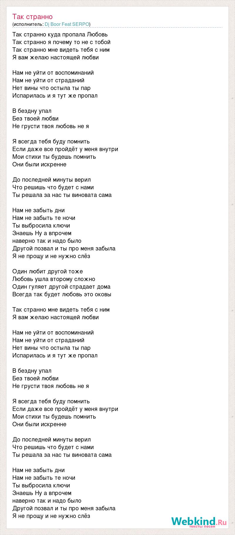 Так странно куда пропала Любовь Так странно я почему то не с тобой Так странно мне видеть тебя с ним Я вам желаю настоящей любви Нам не уйти от воспоминаний Нам не уйти от страданий Нет вины что остыла ты пар Испарилась и я тут же пропал В бездну упал Без твоей любви Не грусти твоя любовь не я Я всегда тебя буду помнить Если даже все пройдёт у меня внутри Мои стихи ты будешь помнить Они были искренне До последней минуты верил Что решишь что будет с нами Ты решала за нас ты виновата сама Нам не забыть дни Нам не забыть те ночи Ты выбросила ключи Знаешь Ну а впрочем наверно так и надо было Другой позвал и ты про меня забыла Я не прощу и не нужно слёз Один любит другой тоже Любовь ушла второму сложно Один гуляет другой страдает дома Всегда так будет любовь это оковы Так странно мне видеть тебя с ним Я вам желаю настоящей любви Нам не уйти от воспоминаний Нам не уйти от страданий Нет вины что остыла ты пар Испарилась и я тут же пропал В бездну упал Без твоей любви Не грусти твоя любовь не я Я всегда тебя буду помнить Если даже все пройдёт у меня внутри Мои стихи ты будешь помнить Они были искренне До последней минуты верил Что решишь что будет с нами Ты решала за нас ты виновата сама Нам не забыть дни Нам не забыть те ночи Ты выбросила ключи Знаешь Ну а впрочем наверно так и надо было Другой позвал и ты про меня забыла Я не прощу и не нужно слёз