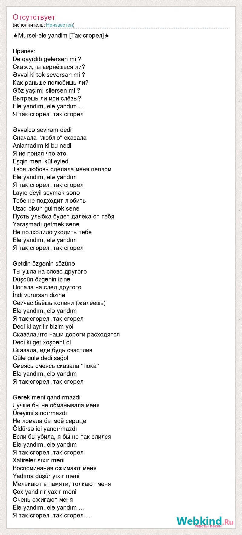 ★Mursel-ele yandim [Так сгорел]★ Припев: De qayıdıb gələrsən mi ? Скажи,ты вернёшься ли? Əvvəl ki tək sevərsən mi ? Как раньше полюбишь ли? Göz yaşımı silərsən mi ? Вытрешь ли мои слёзы? Elə yandım, elə yandım ... Я так сгорел ,так сгорел Əvvəlcə sevirəm dedi Сначала ''люблю'' сказала Anlamadım ki bu nədi Я не понял что это Eşqin məni kül eylədi Твоя любовь сделала меня пеплом Elə yandım, elə yandım Я так сгорел ,так сгорел Layıq deyil sevmək sənə Тебе не подходит любить Uzaq olsun gülmək sənə Пусть улыбка будет далека от тебя Yaraşmadı getmək sənə Не подходило уходить тебе Elə yandım, elə yandım Я так сгорел ,так сгорел Getdin özgənin sözünə Ты ушла на слово другого Düşdün özgənin izinə Попала на след другого İndi vurursan dizinə Сейчас бьёшь колени (жалеешь) Elə yandım, elə yandım Я так сгорел ,так сгорел Dedi ki ayrılır bizim yol Сказала,что наши дороги расходятся Dedi ki get xoşbəht ol Сказала, иди,будь счастлив Gülə gülə dedi sağol Смеясь смеясь сказала ''пока'' Elə yandım, elə yandım Я так сгорел ,так сгорел Gərək məni qandırmazdı Лучше бы не обманывала меня Ürəyimi sındırmazdı Не ломала бы моё сердце Öldürsə idi yandırmazdı Если бы убила, я бы не так злился Elə yandım, elə yandım Я так сгорел ,так сгорел Xatirələr sıxır məni Воспоминания сжимают меня Yadıma düşür yıxır məni Мелькают в памяти, толкают меня Çox yandırır yaxır məni Очень сжигают меня Elə yandım, elə yandım ... Я так сгорел ,так сгорел ...