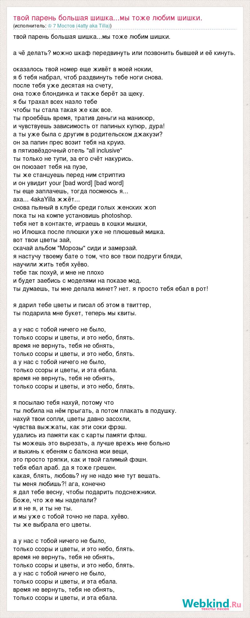 твой парень большая шишка...мы тоже любим шишки. а чё делать? можно шкаф передвинуть или позвонить бывшей и её кинуть. оказалось твой номер еще живёт в моей нокии, я б тебя набрал, чтоб раздвинуть тебе ноги снова. после тебя уже десятая на счету, она тоже блондинка и также берёт за щеку. я бы трахал всех назло тебе чтобы ты стала такая же как все. ты проебёшь время, тратив деньги на маникюр, и чувствуешь зависимость от папиных купюр, дура! а ты уже была с другим в родительском джакузи? он за папин прес возит тебя на круиз. в пятизвёздочный отель "all inclusive" ты только не тупи, за его счёт накурись. он поюзает тебя на пузе, ты же станцуешь перед ним стриптиз и он увидит your [bad word] [bad word] ты еще заплачешь, тогда посмеюсь я... аха... 4akaYilla жжёт... снова пьяный в клубе среди голых женских жоп пока ты на компе установишь photoshop. тебя нет в контакте, играешь в кошки мышки, но Илюшка после плюшки уже не плюшевый мишка. вот твои цветы зай, скачай альбом "Морозы" сиди и замерзай. я настучу твоему бате о том, что все твои подруги бляди, научили жить тебя хуёво. тебе так похуй, и мне не плохо и будет заебись с моделями на показе мод. ты думаешь, ты мне делала минет? нет. я просто тебя ебал в рот! я дарил тебе цветы и писал об этом в твиттер, ты подарила мне букет, теперь мы квиты. а у нас с тобой ничего не было, только ссоры и цветы, и это небо, блять. время не вернуть, тебя не обнять, только ссоры и цветы, и это небо, блять. а у нас с тобой ничего не было, только ссоры и цветы, и эта ебала. время не вернуть, тебя не обнять, только ссоры и цветы, и это небо, блять. я посылаю тебя нахуй, потому что ты любила на нём прыгать, а потом плакать в подушку. нахуй твои сопли, цветы давно засохли, чувства выжжаты, как эти соки фрэш. удались из памяти как с карты памяти флэш. ты можешь это вырезать, а лучше врежь мне больно и выкинь к ебеням с балкона мои вещи, это просто тряпки, как и твой галимый фэшн. тебя ебал араб. да я тоже грешен. какая, блять, любовь? ну не надо мне тут вешать. ты меня любишь?! ага, конечно я дал тебе весну, чтобы подарить подснежники. Боже, что же мы наделали? и я не я, и ты не ты. и мы уже с тобой точно не пара. хуёво. ты же выбрала его цветы. а у нас с тобой ничего не было, только ссоры и цветы, и это небо, блять. время не вернуть, тебя не обнять, только ссоры и цветы, и это небо, блять. а у нас с тобой ничего не было, только ссоры и цветы, и эта ебала. время не вернуть, тебя не обнять, только ссоры и цветы, и эта ебала.