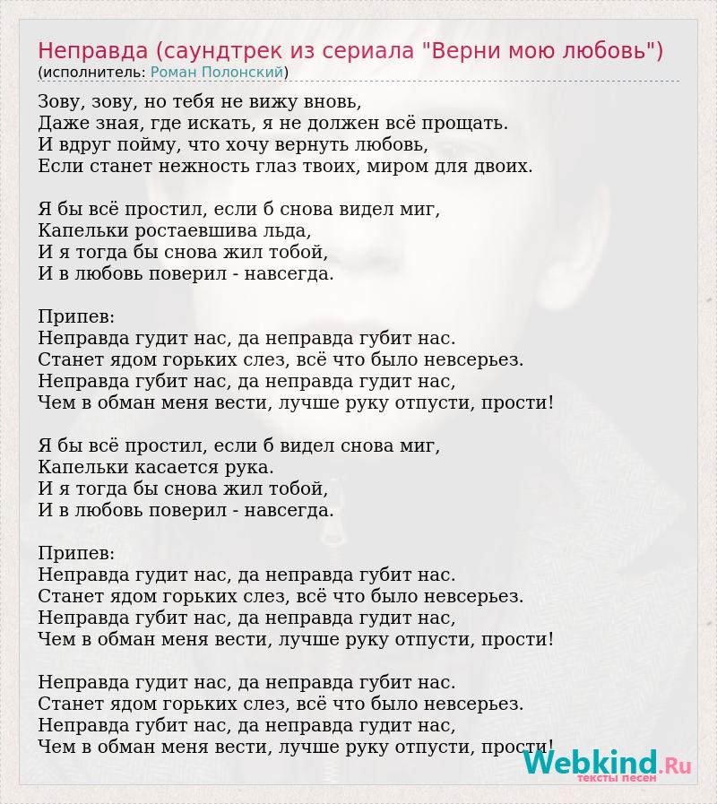 Зову, зову, но тебя не вижу вновь, Даже зная, где искать, я не должен всё прощать. И вдруг пойму, что хочу вернуть любовь, Если станет нежность глаз твоих, миром для двоих. Я бы всё простил, если б снова видел миг, Капельки ростаевшива льда, И я тогда бы снова жил тобой, И в любовь поверил - навсегда. Припев: Неправда гудит нас, да неправда губит нас. Станет ядом горьких слез, всё что было невсерьез. Неправда губит нас, да неправда гудит нас, Чем в обман меня вести, лучше руку отпусти, прости! Я бы всё простил, если б видел снова миг, Капельки касается рука. И я тогда бы снова жил тобой, И в любовь поверил - навсегда. Припев: Неправда гудит нас, да неправда губит нас. Станет ядом горьких слез, всё что было невсерьез. Неправда губит нас, да неправда гудит нас, Чем в обман меня вести, лучше руку отпусти, прости! Неправда гудит нас, да неправда губит нас. Станет ядом горьких слез, всё что было невсерьез. Неправда губит нас, да неправда гудит нас, Чем в обман меня вести, лучше руку отпусти, прости!