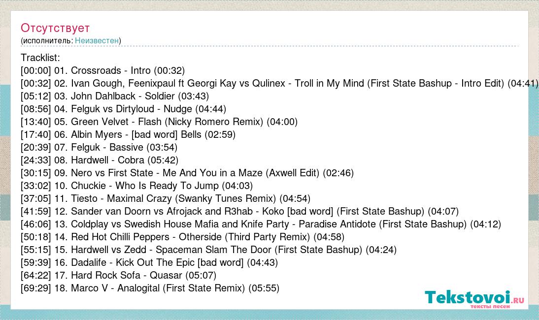 Tracklist: [00:00] 01. Crossroads - Intro (00:32) [00:32] 02. Ivan Gough, Feenixpaul ft Georgi Kay vs Qulinex - Troll in My Mind (First State Bashup - Intro Edit) (04:41) [05:12] 03. John Dahlback - Soldier (03:43) [08:56] 04. Felguk vs Dirtyloud - Nudge (04:44) [13:40] 05. Green Velvet - Flash (Nicky Romero Remix) (04:00) [17:40] 06. Albin Myers - Hells Bells (02:59) [20:39] 07. Felguk - Bassive (03:54) [24:33] 08. Hardwell - Cobra (05:42) [30:15] 09. Nero vs First State - Me And You in a Maze (Axwell Edit) (02:46) [33:02] 10. Chuckie - Who Is Ready To Jump (04:03) [37:05] 11. Tiesto - Maximal Crazy (Swanky Tunes Remix) (04:54) [41:59] 12. Sander van Doorn vs Afrojack and R3hab - Koko Prutata (First State Bashup) (04:07) [46:06] 13. Coldplay vs Swedish House Mafia and Knife Party - Paradise Antidote (First State Bashup) (04:12) [50:18] 14. Red Hot Chilli Peppers - Otherside (Third Party Remix) (04:58) [55:15] 15. Hardwell vs Zedd - Spaceman Slam The Door (First State Bashup) (04:24) [59:39] 16. Dadalife - Kick Out The Epic [bad word] (04:43) [64:22] 17. Hard Rock Sofa - Quasar (05:07) [69:29] 18. Marco V - Analogital (First State Remix) (05:55)