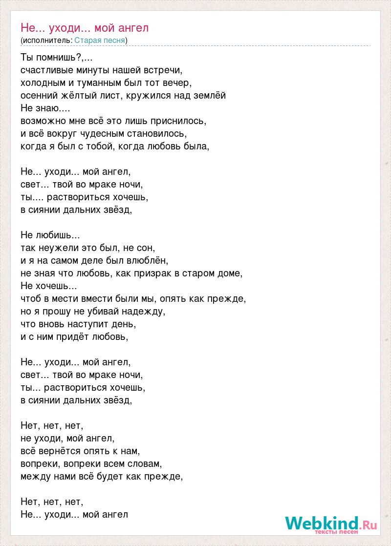 Ты помнишь?,... счастливые минуты нашей встречи, холодным и туманным был тот вечер, осенний жёлтый лист, кружился над землёй Не знаю.... возможно мне всё это лишь приснилось, и всё вокруг чудесным становилось, когда я был с тобой, когда любовь была, Не... уходи... мой ангел, свет... твой во мраке ночи, ты.... раствориться хочешь, в сиянии дальних звёзд, Не любишь... так неужели это был, не сон, и я на самом деле был влюблён, не зная что любовь, как призрак в старом доме, Не хочешь... чтоб в мести вмести были мы, опять как прежде, но я прошу не убивай надежду, что вновь наступит день, и с ним придёт любовь, Не... уходи... мой ангел, свет... твой во мраке ночи, ты... раствориться хочешь, в сиянии дальних звёзд, Нет, нет, нет, не уходи, мой ангел, всё вернётся опять к нам, вопреки, вопреки всем словам, между нами всё будет как прежде, Нет, нет, нет, Не... уходи... мой ангел