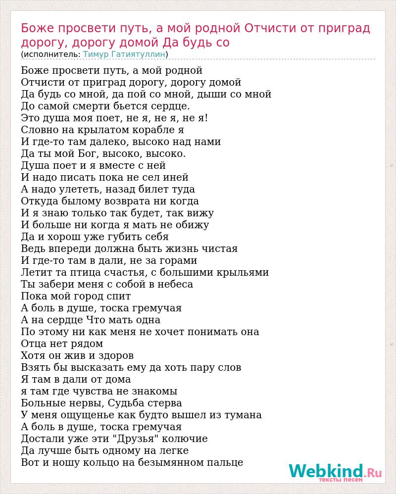 Боже просвети путь, а мой родной Отчисти от приград дорогу, дорогу домой Да будь со мной, да пой со мной, дыши со мной До самой смерти бьется сердце. Это душа моя поет, не я, не я, не я! Словно на крылатом корабле я И где-то там далеко, высоко над нами Да ты мой Бог, высоко, высоко. Душа поет и я вместе с ней И надо писать пока не сел иней А надо улететь, назад билет туда Откуда былому возврата ни когда И я знаю только так будет, так вижу И больше ни когда я мать не обижу Да и хорош уже губить себя Ведь впереди должна быть жизнь чистая И где-то там в дали, не за горами Летит та птица счастья, с большими крыльями Ты забери меня с собой в небеса Пока мой город спит А боль в душе, тоска гремучая А на сердце Что мать одна По этому ни как меня не хочет понимать она Отца нет рядом Хотя он жив и здоров Взять бы высказать ему да хоть пару слов Я там в дали от дома я там где чувства не знакомы Больные нервы, Судьба стерва У меня ощущенье как будто вышел из тумана А боль в душе, тоска гремучая Достали уже эти "Друзья" колючие Да лучше быть одному на легке Вот и ношу кольцо на безымянном пальце