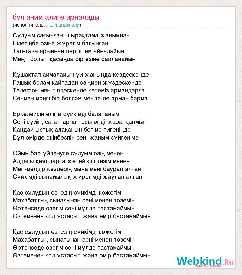 Сұлуым сағынған, шырақтама жанымнан Білесіңбе өзіңе жүрегім бағынған Тап-таза арыңнан,періштем айналайын Мәңгі болып қасыңда бір өзіңе байланайын Құшақтап аймалайын үй жанында кездескенде Ғашық болам қайтадан өзіңмен жүздескенде Телефон мен тілдескенде кетеміз армандарға Сенмен мәңгі бір болсам менде де арман барма Еркелейсің елігім сүйкімді балапаным Сені сүйіп, саған арнап осы әнді жаратқанмын Қандай ыстық алақанын бетіме тигеніңде Бұл өмірде өкінбеспін сені жаным сүйгеніме Ойым бар үйленуге сұлуым өзің менен Алдағы қиялдарға жетейікші төзім менен Мөп-мөлдір көздерің мына мені баурап алған Сүйкімді сыпайылық жүрегімді жаулап алған Қас сұлудың өзі едің сүйкімді көжегім Махабаттың сынағынан сені менен төземін Өртенседе өзегім сені мүлде тастамаймын Өзгеменен қол ұстасып жаңа өмір бастамаймын Қас сұлудың өзі едің сүйкімді көжегім Махабаттың сынағынан сені менен төземін Өртенседе өзегім сені мүлде тастамаймын Өзгеменен қол ұстасып жаңа өмір бастамаймын