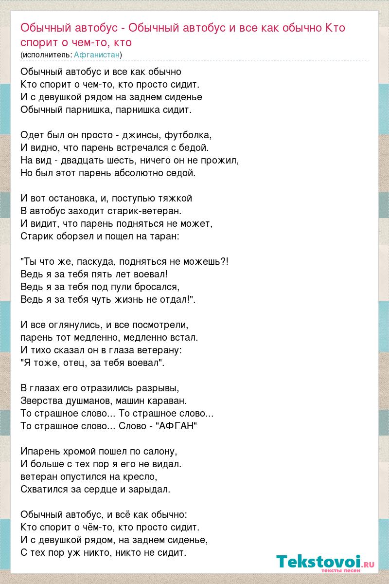Обычный автобус и все как обычно Кто спорит о чем-то, кто просто сидит. И с девушкой рядом на заднем сиденье Обычный парнишка, парнишка сидит. Одет был он просто - джинсы, футболка, И видно, что парень встречался с бедой. На вид - двадцать шесть, ничего он не прожил, Но был этот парень абсолютно седой. И вот остановка, и, поступью тяжкой В автобус заходит старик-ветеран. И видит, что парень подняться не может, Старик оборзел и пощел на таран: "Ты что же, паскуда, подняться не можешь?! Ведь я за тебя пять лет воевал! Ведь я за тебя под пули бросался, Ведь я за тебя чуть жизнь не отдал!". И все оглянулись, и все посмотрели, парень тот медленно, медленно встал. И тихо сказал он в глаза ветерану: "Я тоже, отец, за тебя воевал". В глазах его отразились разрывы, Зверства душманов, машин караван. То страшное слово... То страшное слово... То страшное слово... Слово - "АФГАН" Ипарень хромой пошел по салону, И больше с тех пор я его не видал. ветеран опустился на кресло, Схватился за сердце и зарыдал. Обычный автобус, и всё как обычно: Кто спорит о чём-то, кто просто сидит. И с девушкой рядом, на заднем сиденье, С тех пор уж никто, никто не сидит.