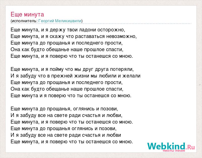 Еще минута, и я держу твои ладони осторожно, Еще минута, и я скажу что раставаться невозможно, Еще минута до прощанья и последнего прости, Она как будто обещанье наше прошлое спасти, Еще минута, и я поверю что ты останешся со мною. Еще минута, и я пойму что мы друг друга потеряли, И я забуду что в прежней жизни мы любили и желали Еще минута до прощанья и последнего прости, Она как будто обещанье наше прошлое спасти, Еще минута и я поверю что ты останешся со мною. Еще минута до прощанья, оглянись и позови, И я забуду все на свете ради счастья и любви, Еще минута, и я поверю что ты останешся со мною. Еще минута до прощанья оглянись и позови, И я забуду все на свете ради счастья и любви Еще минута, и я поверю что ты останешся со мною.