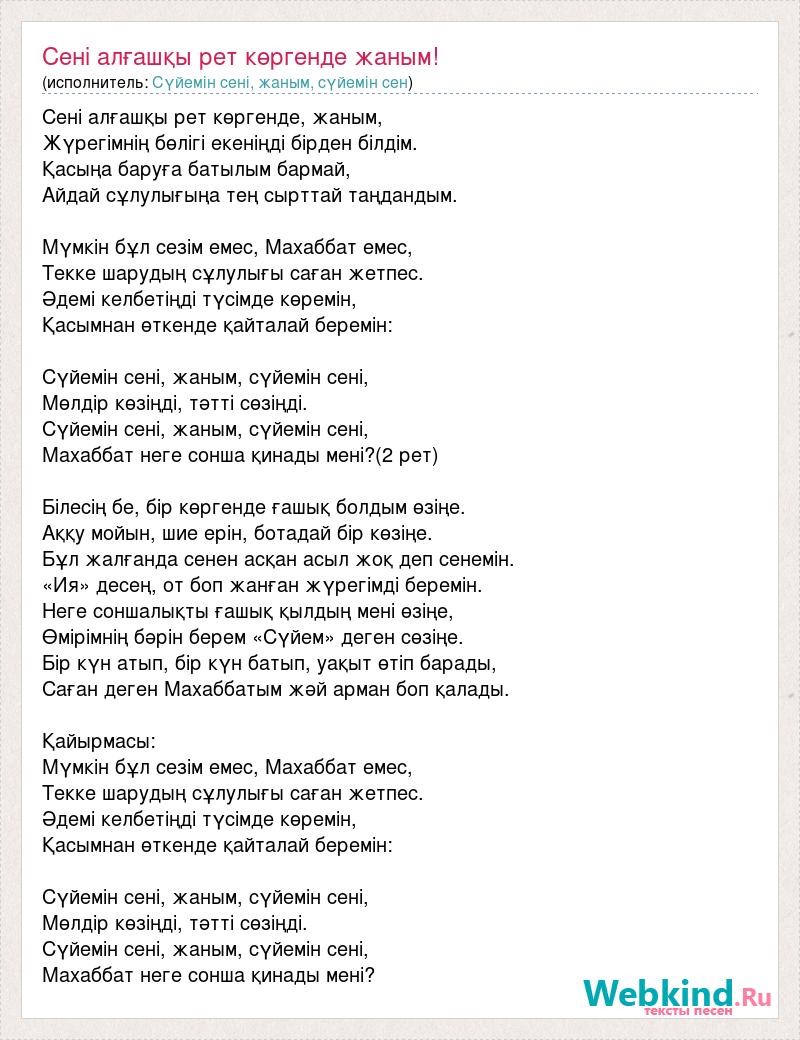 Сені алғашқы рет көргенде, жаным, Жүрегімнің бөлігі екеніңді бірден білдім. Қасыңа баруға батылым бармай, Айдай сұлулығыңа тең сырттай таңдандым. Мүмкін бұл сезім емес, Махаббат емес, Текке шарудың сұлулығы саған жетпес. Әдемі келбетіңді түсімде көремін, Қасымнан өткенде қайталай беремін: Сүйемін сені, жаным, сүйемін сені, Мөлдір көзіңді, тәтті сөзіңді. Сүйемін сені, жаным, сүйемін сені, Махаббат неге сонша қинады мені?(2 рет) Білесің бе, бір көргенде ғашық болдым өзіңе. Аққу мойын, шие ерін, ботадай бір көзіңе. Бұл жалғанда сенен асқан асыл жоқ деп сенемін. «Ия» десең, от боп жанған жүрегімді беремін. Неге соншалықты ғашық қылдың мені өзіңе, Өмірімнің бәрін берем «Сүйем» деген сөзіңе. Бір күн атып, бір күн батып, уақыт өтіп барады, Саған деген Махаббатым жәй арман боп қалады. Қайырмасы: Мүмкін бұл сезім емес, Махаббат емес, Текке шарудың сұлулығы саған жетпес. Әдемі келбетіңді түсімде көремін, Қасымнан өткенде қайталай беремін: Сүйемін сені, жаным, сүйемін сені, Мөлдір көзіңді, тәтті сөзіңді. Сүйемін сені, жаным, сүйемін сені, Махаббат неге сонша қинады мені?