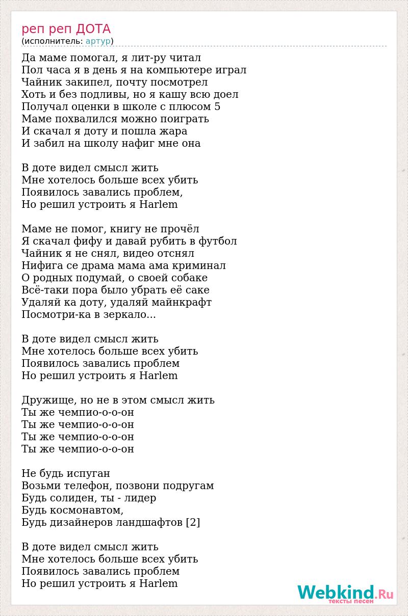Да маме помогал, я лит-ру читал Пол часа я в день я на компьютере играл Чайник закипел, почту посмотрел Хоть и без подливы, но я кашу всю доел Получал оценки в школе с плюсом 5 Маме похвалился можно поиграть И скачал я доту и пошла жара И забил на школу нафиг мне она В доте видел смысл жить Мне хотелось больше всех убить Появилось завались проблем, Но решил устроить я Harlem Маме не помог, книгу не прочёл Я скачал фифу и давай рубить в футбол Чайник я не снял, видео отснял Нифига се драма мама ама криминал О родных подумай, о своей собаке Всё-таки пора было убрать её саке Удаляй ка доту, удаляй майнкрафт Посмотри-ка в зеркало... В доте видел смысл жить Мне хотелось больше всех убить Появилось завались проблем Но решил устроить я Harlem Дружище, но не в этом смысл жить Ты же чемпио-о-о-он Ты же чемпио-о-о-он Ты же чемпио-о-о-он Ты же чемпио-о-о-он Не будь испуган Возьми телефон, позвони подругам Будь солиден, ты - лидер Будь космонавтом, Будь дизайнеров ландшафтов [2] В доте видел смысл жить Мне хотелось больше всех убить Появилось завались проблем Но решил устроить я Harlem