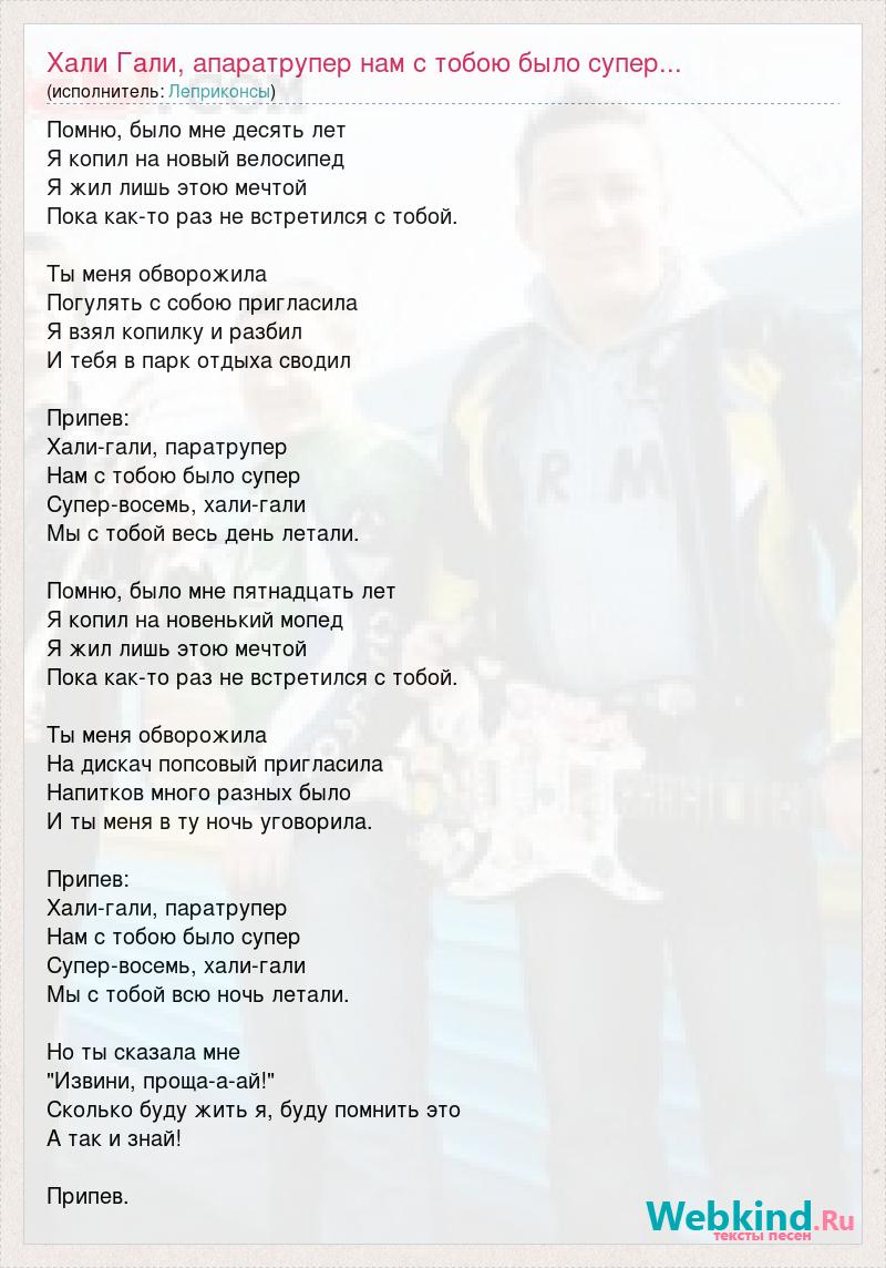 Помню, было мне десять лет Я копил на новый велосипед Я жил лишь этою мечтой Пока как-то раз не встретился с тобой. Ты меня обворожила Погулять с собою пригласила Я взял копилку и разбил И тебя в парк отдыха сводил Припев: Хали-гали, паратрупер Нам с тобою было супер Супер-восемь, хали-гали Мы с тобой весь день летали. Помню, было мне пятнадцать лет Я копил на новенький мопед Я жил лишь этою мечтой Пока как-то раз не встретился с тобой. Ты меня обворожила На дискач попсовый пригласила Напитков много разных было И ты меня в ту ночь уговорила. Припев: Хали-гали, паратрупер Нам с тобою было супер Супер-восемь, хали-гали Мы с тобой всю ночь летали. Но ты сказала мне "Извини, проща-а-ай!" Сколько буду жить я, буду помнить это А так и знай! Припев.
