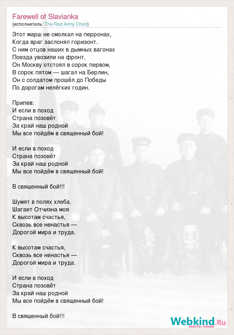 Этот марш не смолкал на перронах, Когда враг заслонял горизонт. С ним отцов наших в дымных вагонах Поезда увозили на фронт. Он Москву отстоял в сорок первом, В сорок пятом — шагал на Берлин, Он с солдатом прошёл до Победы По дорогам нелёгких годин. Припев: И если в поход Страна позовёт За край наш родной Мы все пойдём в священный бой! И если в поход Страна позовёт За край наш родной Мы все пойдём в священный бой! В священный бой!!! Шумят в полях хлеба. Шагает Отчизна моя К высотам счастья, Сквозь все ненастья — Дорогой мира и труда. К высотам счастья, Сквозь все ненастья — Дорогой мира и труда. И если в поход Страна позовёт За край наш родной Мы все пойдём в священный бой! В священный бой!!!