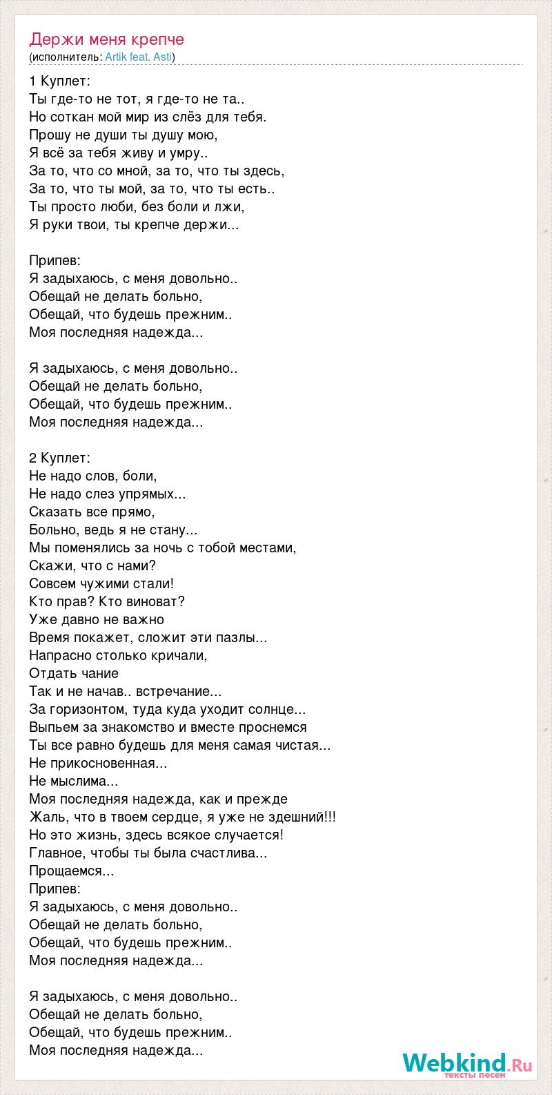 1 Куплет: Ты где-то не тот, я где-то не та.. Но соткан мой мир из слёз для тебя. Прошу не души ты душу мою, Я всё за тебя живу и умру.. За то, что со мной, за то, что ты здесь, За то, что ты мой, за то, что ты есть.. Ты просто люби, без боли и лжи, Я руки твои, ты крепче держи... Припев: Я задыхаюсь, с меня довольно.. Обещай не делать больно, Обещай, что будешь прежним.. Моя последняя надежда... Я задыхаюсь, с меня довольно.. Обещай не делать больно, Обещай, что будешь прежним.. Моя последняя надежда... 2 Куплет: Не надо слов, боли, Не надо слез упрямых... Сказать все прямо, Больно, ведь я не стану... Мы поменялись за ночь с тобой местами, Скажи, что с нами? Совсем чужими стали! Кто прав? Кто виноват? Уже давно не важно Время покажет, сложит эти пазлы... Напрасно столько кричали, Отдать чание Так и не начав.. встречание... За горизонтом, туда куда уходит солнце... Выпьем за знакомство и вместе проснемся Ты все равно будешь для меня самая чистая... Не прикосновенная... Не мыслима... Моя последняя надежда, как и прежде Жаль, что в твоем сердце, я уже не здешний!!! Но это жизнь, здесь всякое случается! Главное, чтобы ты была счастлива... Прощаемся... Припев: Я задыхаюсь, с меня довольно.. Обещай не делать больно, Обещай, что будешь прежним.. Моя последняя надежда... Я задыхаюсь, с меня довольно.. Обещай не делать больно, Обещай, что будешь прежним.. Моя последняя надежда...