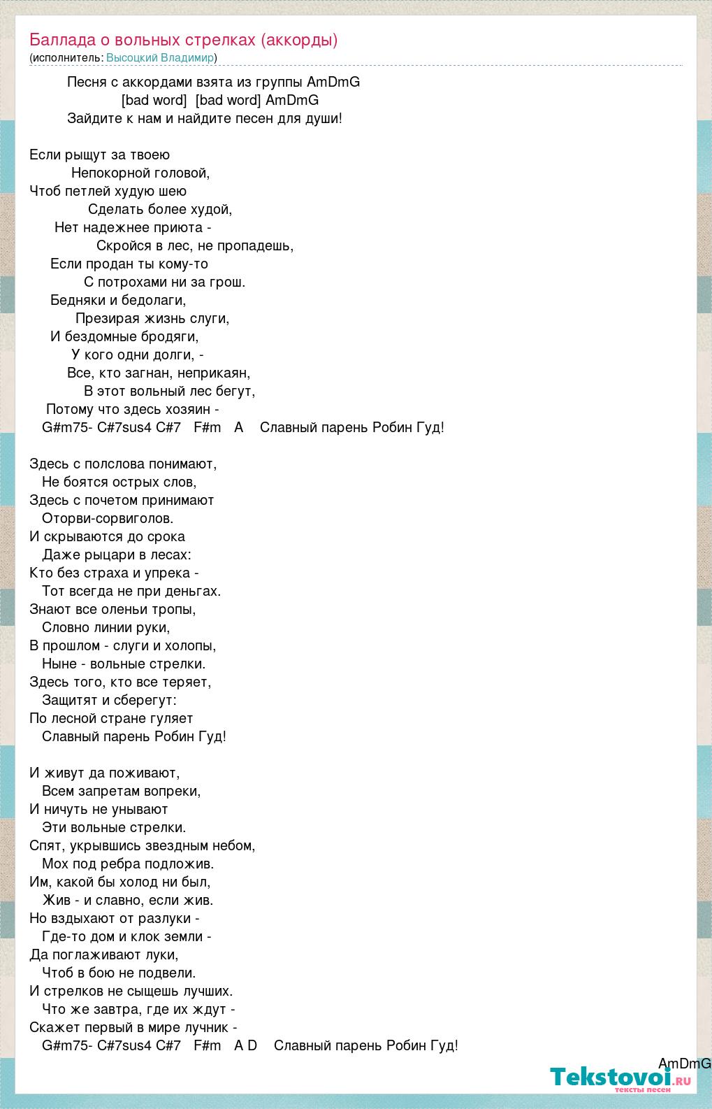 Песня с аккордами взята из группы AmDmG [bad word] [bad word] AmDmG Зайдите к нам и найдите песен для души! Если рыщут за твоею Непокорной головой, Чтоб петлей худую шею Сделать более худой, Нет надежнее приюта - Скройся в лес, не пропадешь, Если продан ты кому-то С потрохами ни за грош. Бедняки и бедолаги, Презирая жизнь слуги, И бездомные бродяги, У кого одни долги, - Все, кто загнан, неприкаян, В этот вольный лес бегут, Потому что здесь хозяин - G#m75- C#7sus4 C#7 F#m A Славный парень Робин Гуд! Здесь с полслова понимают, Не боятся острых слов, Здесь с почетом принимают Оторви-сорвиголов. И скрываются до срока Даже рыцари в лесах: Кто без страха и упрека - Тот всегда не при деньгах. Знают все оленьи тропы, Словно линии руки, В прошлом - слуги и холопы, Ныне - вольные стрелки. Здесь того, кто все теряет, Защитят и сберегут: По лесной стране гуляет Славный парень Робин Гуд! И живут да поживают, Всем запретам вопреки, И ничуть не унывают Эти вольные стрелки. Спят, укрывшись звездным небом, Мох под ребра подложив. Им, какой бы холод ни был, Жив - и славно, если жив. Но вздыхают от разлуки - Где-то дом и клок земли - Да поглаживают луки, Чтоб в бою не подвели. И стрелков не сыщешь лучших. Что же завтра, где их ждут - Скажет первый в мире лучник - G#m75- C#7sus4 C#7 F#m A D Славный парень Робин Гуд! AmDmG