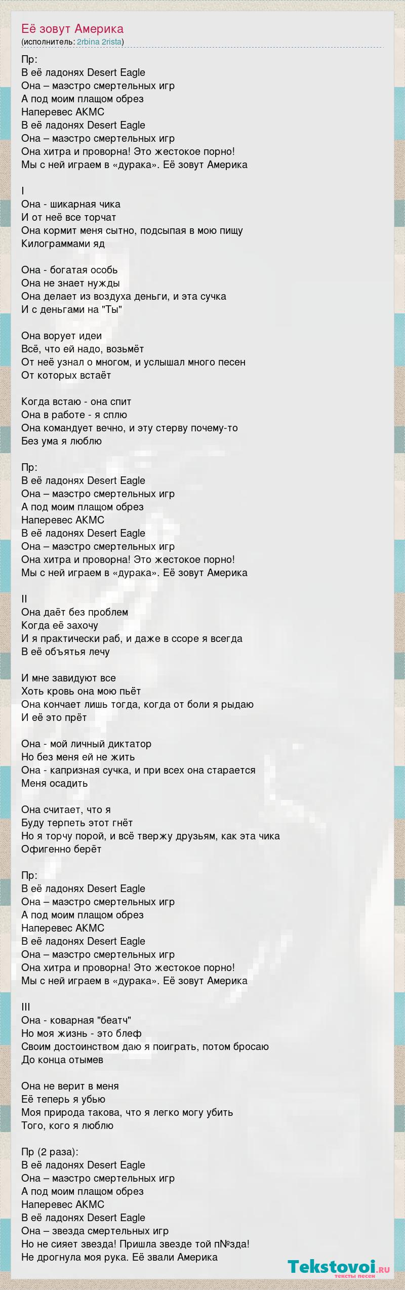 Пр: В её ладонях Desert Eagle Она – маэстро смертельных игр А под моим плащом обрез Наперевес АКМС В её ладонях Desert Eagle Она – маэстро смертельных игр Она хитра и проворна! Это жестокое порно! Мы с ней играем в «дурака». Её зовут Америка I Она - шикарная чика И от неё все торчат Она кормит меня сытно, подсыпая в мою пищу Килограммами яд Она - богатая особь Она не знает нужды Она делает из воздуха деньги, и эта сучка И с деньгами на "Ты" Она ворует идеи Всё, что ей надо, возьмёт От неё узнал о многом, и услышал много песен От которых встаёт Когда встаю - она спит Она в работе - я сплю Она командует вечно, и эту стерву почему-то Без ума я люблю Пр: В её ладонях Desert Eagle Она – маэстро смертельных игр А под моим плащом обрез Наперевес АКМС В её ладонях Desert Eagle Она – маэстро смертельных игр Она хитра и проворна! Это жестокое порно! Мы с ней играем в «дурака». Её зовут Америка II Она даёт без проблем Когда её захочу И я практически раб, и даже в ссоре я всегда В её объятья лечу И мне завидуют все Хоть кровь она мою пьёт Она кончает лишь тогда, когда от боли я рыдаю И её это прёт Она - мой личный диктатор Но без меня ей не жить Она - капризная сучка, и при всех она старается Меня осадить Она считает, что я Буду терпеть этот гнёт Но я торчу порой, и всё твержу друзьям, как эта чика Офигенно берёт Пр: В её ладонях Desert Eagle Она – маэстро смертельных игр А под моим плащом обрез Наперевес АКМС В её ладонях Desert Eagle Она – маэстро смертельных игр Она хитра и проворна! Это жестокое порно! Мы с ней играем в «дурака». Её зовут Америка III Она - коварная "беатч" Но моя жизнь - это блеф Своим достоинством даю я поиграть, потом бросаю До конца отымев Она не верит в меня Её теперь я убью Моя природа такова, что я легко могу убить Того, кого я люблю Пр (2 раза): В её ладонях Desert Eagle Она – маэстро смертельных игр А под моим плащом обрез Наперевес АКМС В её ладонях Desert Eagle Она – звезда смертельных игр Но не сияет звезда! Пришла звезде той п№зда! Не дрогнула моя рука. Её звали Америка