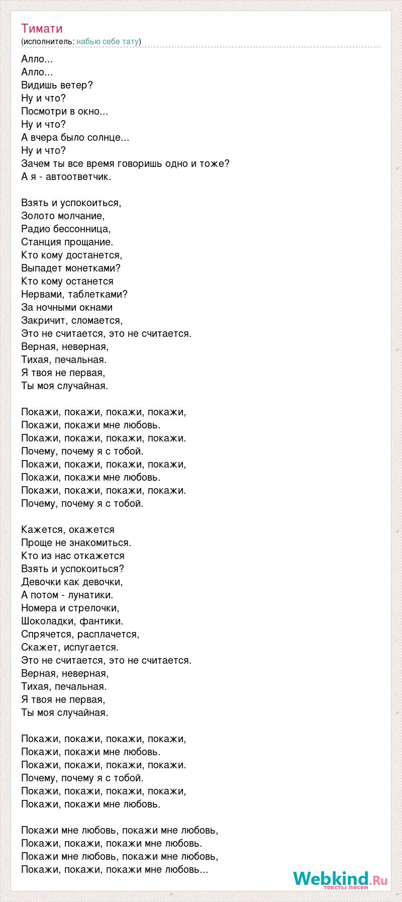 Алло... Алло... Видишь ветер? Ну и что? Посмотри в окно... Ну и что? А вчера было солнце... Ну и что? Зачем ты все время говоришь одно и тоже? А я - автоответчик. Взять и успокоиться, Золото молчание, Радио бессонница, Станция прощание. Кто кому достанется, Выпадет монетками? Кто кому останется Нервами, таблетками? За ночными окнами Закричит, сломается, Это не считается, это не считается. Верная, неверная, Тихая, печальная. Я твоя не первая, Ты моя случайная. Покажи, покажи, покажи, покажи, Покажи, покажи мне любовь. Покажи, покажи, покажи, покажи. Почему, почему я с тобой. Покажи, покажи, покажи, покажи, Покажи, покажи мне любовь. Покажи, покажи, покажи, покажи. Почему, почему я с тобой. Кажется, окажется Проще не знакомиться. Кто из нас откажется Взять и успокоиться? Девочки как девочки, А потом - лунатики. Номера и стрелочки, Шоколадки, фантики. Спрячется, расплачется, Скажет, испугается. Это не считается, это не считается. Верная, неверная, Тихая, печальная. Я твоя не первая, Ты моя случайная. Покажи, покажи, покажи, покажи, Покажи, покажи мне любовь. Покажи, покажи, покажи, покажи. Почему, почему я с тобой. Покажи, покажи, покажи, покажи, Покажи, покажи мне любовь. Покажи мне любовь, покажи мне любовь, Покажи, покажи, покажи мне любовь. Покажи мне любовь, покажи мне любовь, Покажи, покажи, покажи мне любовь...