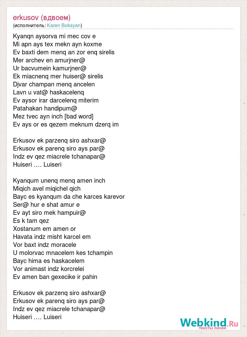 Kyanqn aysorva mi mec cov e Mi apn ays tex mekn ayn koxme Ev baxti dem menq an zor enq sirelis Mer archev en amurjner@ Ur bacvumein kamurjner@ Ek miacnenq mer huiser@ sirelis Djvar champan menq ancelen Lavn u vat@ haskacelenq Ev aysor irar darcelenq miterim Patahakan handipum@ Mez tvec ayn inch [bad word] Ev ays or es qezem meknum dzerq im Erkusov ek parzenq siro ashxar@ Erkusov ek parenq siro ays par@ Indz ev qez miacrele tchanapar@ Huiseri …. Luiseri Kyanqum unenq menq amen inch Miqich avel miqichel qich Bayc es kyanqum da che karces karevor Ser@ hur e shat amur e Ev ayt siro mek hampuir@ Es k tam qez Xostanum em amen or Havata indz misht karcel em Vor baxt indz moracele U molorvac mnacelem kes tchampin Bayc hima es haskacelem Vor animast indz korcrelei Ev amen ban gexecike ir pahin Erkusov ek parzenq siro ashxar@ Erkusov ek parenq siro ays par@ Indz ev qez miacrele tchanapar@ Huiseri …. Luiseri