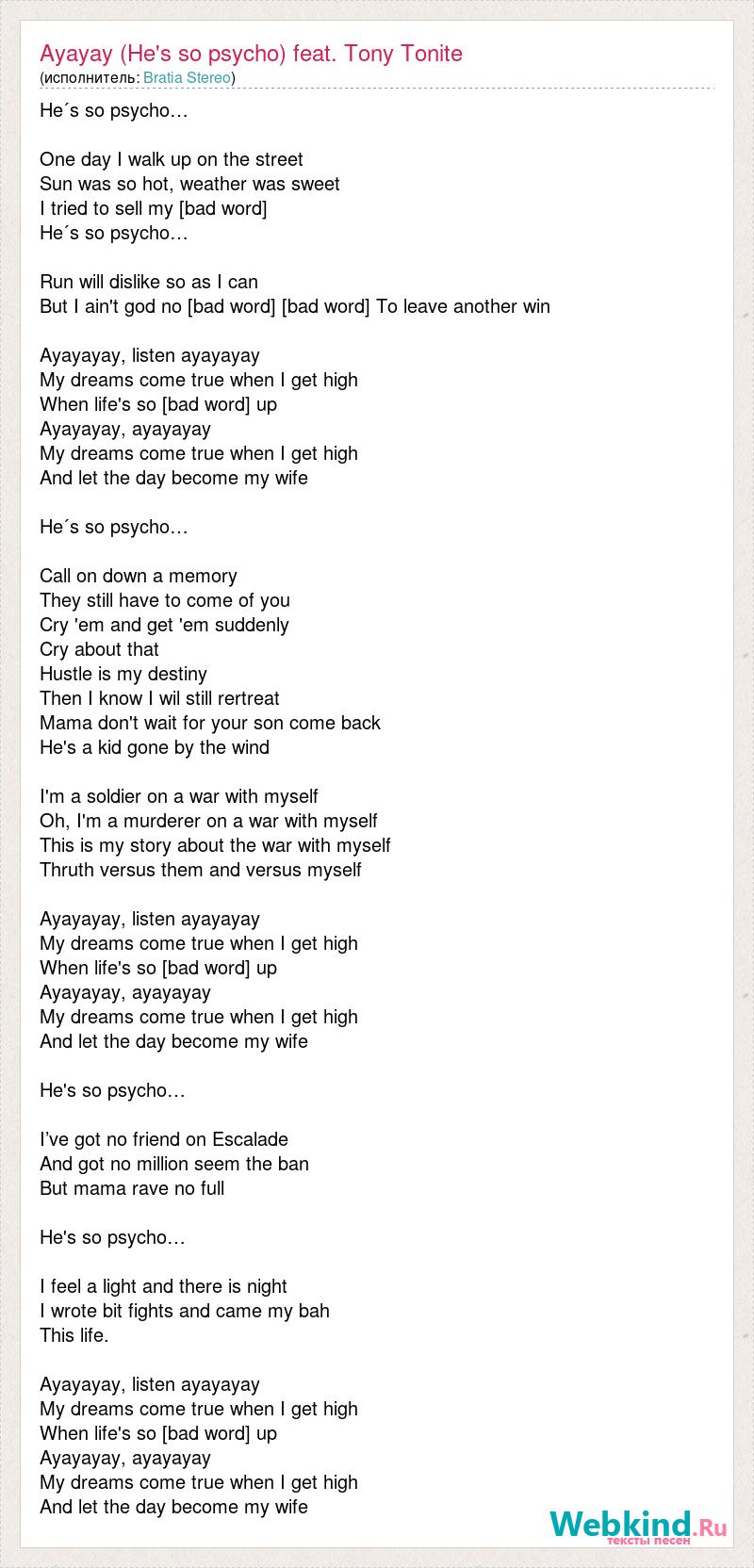 He´s so psycho… One day I walk up on the street Sun was so hot, weather was sweet I tried to sell my [bad word] He´s so psycho… Run will dislike so as I can But I ain't god no [bad word] [bad word] To leave another win Ayayayay, listen ayayayay My dreams come true when I get high When life's so [bad word] up Ayayayay, ayayayay My dreams come true when I get high And let the day become my wife He´s so psycho… Call on down a memory They still have to come of you Cry 'em and get 'em suddenly Cry about that Hustle is my destiny Then I know I wil still rertreat Mama don't wait for your son come back He's a kid gone by the wind I'm a soldier on a war with myself Oh, I'm a murderer on a war with myself This is my story about the war with myself Thruth versus them and versus myself Ayayayay, listen ayayayay My dreams come true when I get high When life's so [bad word] up Ayayayay, ayayayay My dreams come true when I get high And let the day become my wife He's so psycho… I’ve got no friend on Escalade And got no million seem the ban But mama rave no full He's so psycho… I feel a light and there is night I wrote bit fights and came my bah This life. Ayayayay, listen ayayayay My dreams come true when I get high When life's so [bad word] up Ayayayay, ayayayay My dreams come true when I get high And let the day become my wife