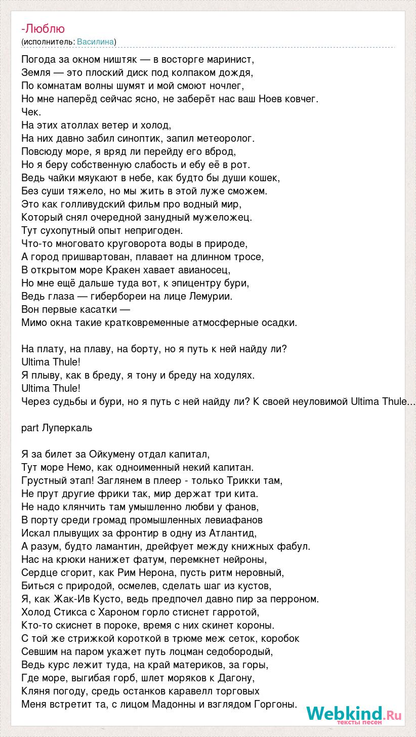 Погода за окном ништяк — в восторге маринист, Земля — это плоский диск под колпаком дождя, По комнатам волны шумят и мой смоют ночлег, Но мне наперёд сейчас ясно, не заберёт нас ваш Ноев ковчег. Чек. На этих атоллах ветер и холод, На них давно забил синоптик, запил метеоролог. Повсюду море, я вряд ли перейду его вброд, Но я беру собственную слабость и ебу её в рот. Ведь чайки мяукают в небе, как будто бы души кошек, Без суши тяжело, но мы жить в этой луже сможем. Это как голливудский фильм про водный мир, Который снял очередной занудный мужеложец. Тут сухопутный опыт непригоден. Что-то многовато круговорота воды в природе, А город пришвартован, плавает на длинном тросе, В открытом море Кракен хавает авианосец, Но мне ещё дальше туда вот, к эпицентру бури, Ведь глаза — гибербореи на лице Лемурии. Вон первые касатки — Мимо окна такие кратковременные атмосферные осадки. На плату, на плаву, на борту, но я путь к ней найду ли? Ultima Thule! Я плыву, как в бреду, я тону и бреду на ходулях. Ultima Thule! Через судьбы и бури, но я путь с ней найду ли? К своей неуловимой Ultima Thule... part Луперкаль Я за билет за Ойкумену отдал капитал, Тут море Немо, как одноименный некий капитан. Грустный этап! Заглянем в плеер - только Трикки там, Не прут другие фрики так, мир держат три кита. Не надо клянчить там умышленно любви у фанов, В порту среди громад промышленных левиафанов Искал плывущих за фронтир в одну из Атлантид, А разум, будто ламантин, дрейфует между книжных фабул. Нас на крюки нанижет фатум, перемкнет нейроны, Сердце сгорит, как Рим Нерона, пусть ритм неровный, Биться с природой, осмелев, сделать шаг из кустов, Я, как Жак-Ив Кусто, ведь предпочел давно пир за перроном. Холод Стикса с Хароном горло стиснет гарротой, Кто-то скиснет в пороке, время с них скинет короны. С той же стрижкой короткой в трюме меж сеток, коробок Севшим на паром укажет путь лоцман седобородый, Ведь курс лежит туда, на край материков, за горы, Где море, выгибая горб, шлет моряков к Дагону, Кляня погоду, средь останков каравелл торговых Меня встретит та, с лицом Мадонны и взглядом Горгоны.