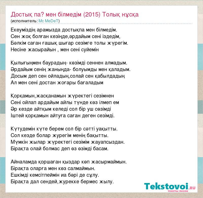 А как ты думаешь, о чем песня "Достық па? мен білмедім (2015) Толық нұсқа" ?