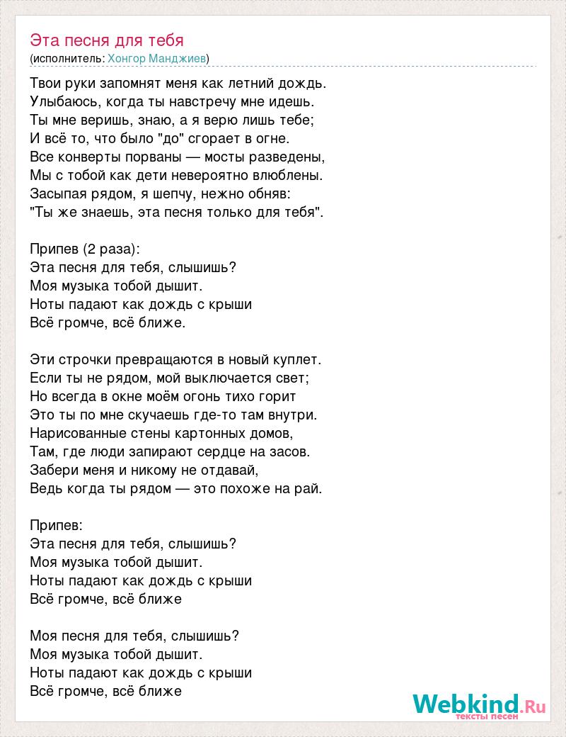 Твои руки запомнят меня как летний дождь. Улыбаюсь, когда ты навстречу мне идешь. Ты мне веришь, знаю, а я верю лишь тебе; И всё то, что было "до" сгорает в огне. Все конверты порваны — мосты разведены, Мы с тобой как дети невероятно влюблены. Засыпая рядом, я шепчу, нежно обняв: "Ты же знаешь, эта песня только для тебя". Припев (2 раза): Эта песня для тебя, слышишь? Моя музыка тобой дышит. Ноты падают как дождь с крыши Всё громче, всё ближе. Эти строчки превращаются в новый куплет. Если ты не рядом, мой выключается свет; Но всегда в окне моём огонь тихо горит Это ты по мне скучаешь где-то там внутри. Нарисованные стены картонных домов, Там, где люди запирают сердце на засов. Забери меня и никому не отдавай, Ведь когда ты рядом — это похоже на рай. Припев: Эта песня для тебя, слышишь? Моя музыка тобой дышит. Ноты падают как дождь с крыши Всё громче, всё ближе Моя песня для тебя, слышишь? Моя музыка тобой дышит. Ноты падают как дождь с крыши Всё громче, всё ближе