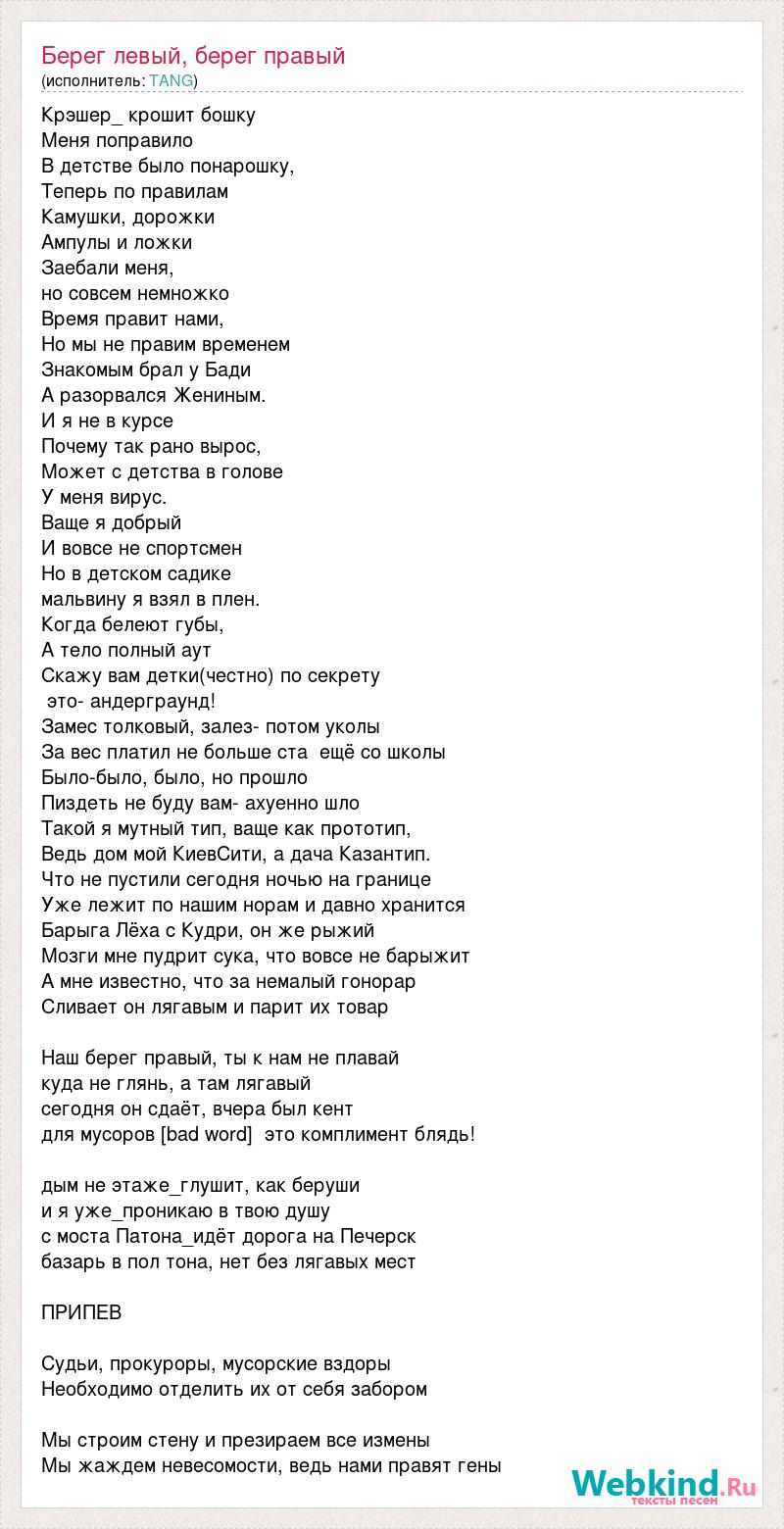 Крэшер_ крошит бошку Меня поправило В детстве было понарошку, Теперь по правилам Камушки, дорожки Ампулы и ложки Заебали меня, но совсем немножко Время правит нами, Но мы не правим временем Знакомым брал у Бади А разорвался Жениным. И я не в курсе Почему так рано вырос, Может с детства в голове У меня вирус. Ваще я добрый И вовсе не спортсмен Но в детском садике мальвину я взял в плен. Когда белеют губы, А тело полный аут Скажу вам детки(честно) по секрету это- андерграунд! Замес толковый, залез- потом уколы За вес платил не больше ста ещё со школы Было-было, было, но прошло Пиздеть не буду вам- ахуенно шло Такой я мутный тип, ваще как прототип, Ведь дом мой КиевСити, а дача Казантип. Что не пустили сегодня ночью на границе Уже лежит по нашим норам и давно хранится Барыга Лёха с Кудри, он же рыжий Мозги мне пудрит сука, что вовсе не барыжит А мне известно, что за немалый гонорар Сливает он лягавым и парит их товар Наш берег правый, ты к нам не плавай куда не глянь, а там лягавый сегодня он сдаёт, вчера был кент для мусоров [bad word] это комплимент блядь! дым не этаже_глушит, как беруши и я уже_проникаю в твою душу с моста Патона_идёт дорога на Печерск базарь в пол тона, нет без лягавых мест ПРИПЕВ Судьи, прокуроры, мусорские вздоры Необходимо отделить их от себя забором Мы строим стену и презираем все измены Мы жаждем невесомости, ведь нами правят гены