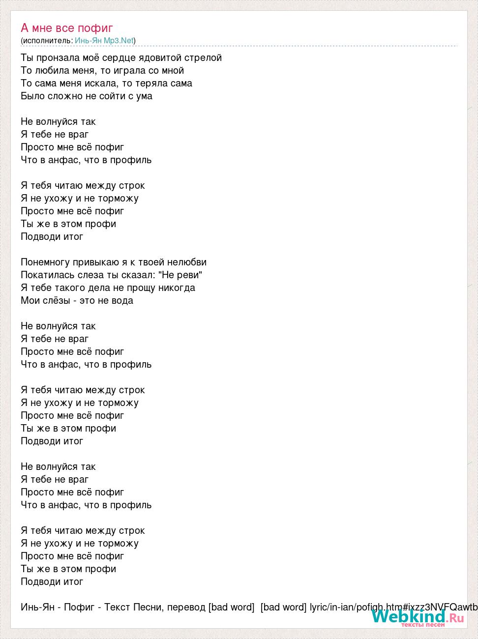 Ты пронзала моё сердце ядовитой стрелой То любила меня, то играла со мной То сама меня искала, то теряла сама Было сложно не сойти с ума Не волнуйся так Я тебе не враг Просто мне всё пофиг Что в анфас, что в профиль Я тебя читаю между строк Я не ухожу и не торможу Просто мне всё пофиг Ты же в этом профи Подводи итог Понемногу привыкаю я к твоей нелюбви Покатилась слеза ты сказал: "Не реви" Я тебе такого дела не прощу никогда Мои слёзы - это не вода Не волнуйся так Я тебе не враг Просто мне всё пофиг Что в анфас, что в профиль Я тебя читаю между строк Я не ухожу и не торможу Просто мне всё пофиг Ты же в этом профи Подводи итог Не волнуйся так Я тебе не враг Просто мне всё пофиг Что в анфас, что в профиль Я тебя читаю между строк Я не ухожу и не торможу Просто мне всё пофиг Ты же в этом профи Подводи итог Инь-Ян - Пофиг - Текст Песни, перевод [bad word] [bad word] lyric/in-ian/pofigh.htm#ixzz3NVFQawtb