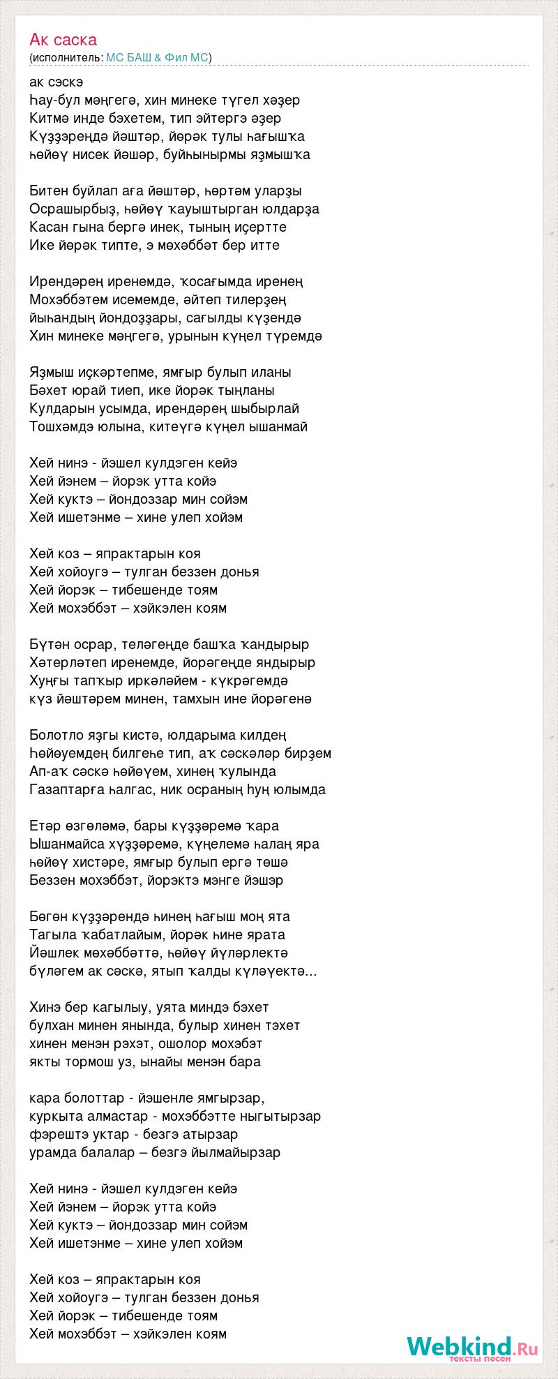 ак сэскэ Һау-бул мәңгегә, хин минеке түгел хәҙер Китмә инде бэхетем, тип эйтергэ әҙер Күҙҙэреңдә йәштәр, йөрәк тулы һағышҡа һөйөү нисек йәшәр, буйһынырмы яҙмышҡа Битен буйлап аға йәштәр, һөртәм уларҙы Осрашырбыҙ, һөйөү ҡауыштырган юлдарҙа Касан гына бергә инек, тының иҫертте Ике йөрәк типте, э мөхәббәт бер итте Ирендәрең иренемдә, ҡосағымда иренең Мохэббэтем исемемде, әйтеп тилерҙең йыһандың йондоҙҙары, сағылды күҙендә Хин минеке мәңгегә, урынын күңел түремдә Яҙмыш иҫкәртепме, ямғыр булып иланы Бәхет юрай тиеп, ике йорәк тыңланы Кулдарын усымда, ирендәрең шыбырлай Тошхәмдэ юлына, китеүгә күңел ышанмай Хей нинэ - йэшел кулдэген кейэ Хей йэнем – йорэк утта койэ Хей куктэ – йондоззар мин сойэм Хей ишетэнме – хине улеп хойэм Хей коз – япрактарын коя Хей хойоугэ – тулган беззен донья Хей йорэк – тибешенде тоям Хей мохэббэт – хэйкэлен коям Бүтән осрар, теләгеңде башҡа ҡандырыр Хәтерләтеп иренемде, йорәгеңде яндырыр Хуңғы тапҡыр иркәләйем - күкрәгемдә күз йәштәрем минен, тамхын ине йорәгенә Болотло яҙгы кистә, юлдарыма килдең Һөйөуемдең билгеһе тип, аҡ сәскәләр бирҙем Ап-аҡ сәскә һөйөүем, хинең ҡулында Газаптарға һалгас, ник осраның hуң юлымда Етәр өзгөләмә, бары күҙҙәремә ҡара Ышанмайса хүҙҙәремә, күңелемә һалаң яра һөйөү хистәре, ямғыр булып ергә төшә Беззен мохэббэт, йорэктэ мэнге йэшэр Бөгөн күҙҙәрендә һинең һағыш моң ята Тагыла ҡабатлайым, йорәк һине ярата Йәшлек мөхәббәттә, һөйөү йүләрлектә бүләгем ак сәскә, ятып ҡалды күләүектә... Хинэ бер кагылыу, уята миндэ бэхет булхан минен янында, булыр хинен тэхет хинен менэн рэхэт, ошолор мохэбэт якты тормош уз, ынайы менэн бара кара болоттар - йэшенле ямгырзар, куркыта алмастар - мохэббэтте ныгытырзар фэрештэ уктар - безгэ атырзар урамда балалар – безгэ йылмайырзар Хей нинэ - йэшел кулдэген кейэ Хей йэнем – йорэк утта койэ Хей куктэ – йондоззар мин сойэм Хей ишетэнме – хине улеп хойэм Хей коз – япрактарын коя Хей хойоугэ – тулган беззен донья Хей йорэк – тибешенде тоям Хей мохэббэт – хэйкэлен коям