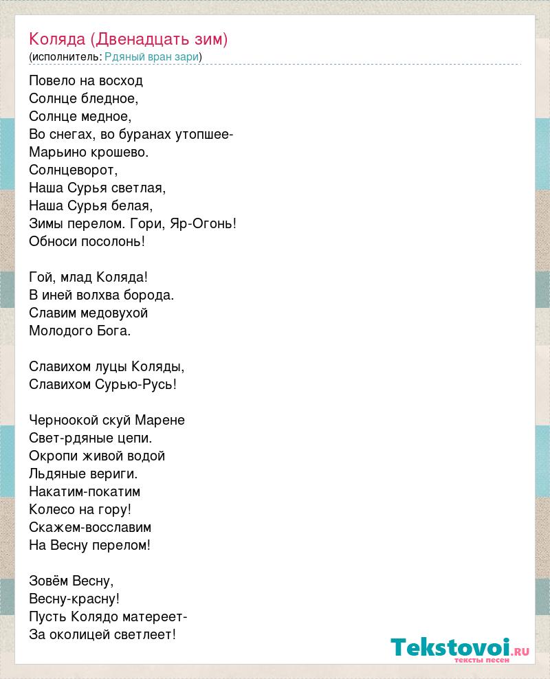 Повело на восход Солнце бледное, Солнце медное, Во снегах, во буранах утопшее- Марьино крошево. Солнцеворот, Наша Сурья светлая, Наша Сурья белая, Зимы перелом. Гори, Яр-Огонь! Обноси посолонь! Гой, млад Коляда! В иней волхва борода. Славим медовухой Молодого Бога. Славихом луцы Коляды, Славихом Сурью-Русь! Черноокой скуй Марене Свет-рдяные цепи. Окропи живой водой Льдяные вериги. Накатим-покатим Колесо на гору! Скажем-восславим На Весну перелом! Зовём Весну, Весну-красну! Пусть Колядо матереет- За околицей светлеет!